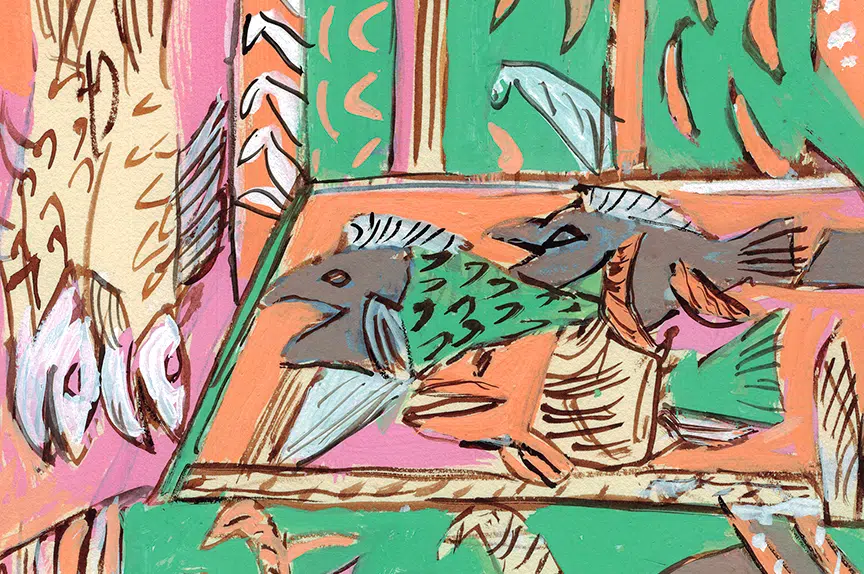 Fish is being sold on the pavement. Alley cats wait in anticipation of morsels. Nearby, a rooster awaits his fate, and the meat seller sharpens his knife keeping an eye on his goat. There’s a sense of déjà vu…. I realise we have seen it all in K.G. Subramanyan’s paintings! We spend an hour with the artist himself, whom we know and love as Mani Da, and his wife Susheela ji over lunch and local gossip. And yes, we plan a solo exhibition.