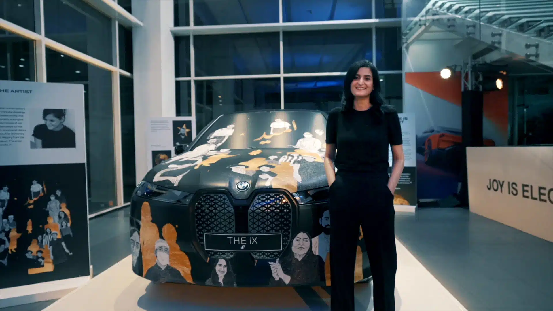 The first all-electric BMW iX exemplifies principles of sustainability throughout its lifecycle. Right from production to the road to the end of its life, the iX is a green machine through and through, making it a perfect canvas for an artist to imagine a future of the next generation. Urdu words in gold lettering that spell out ‘umeed’ or ‘to hope’, ‘tasawur’ or to ‘imagine’, ‘nigehbaan’ or ‘to safeguard’ and the title, ‘suno’ or ‘to listen’, are placed amongst portraits of people from our community, and add to the car’s sustainable philosophy.