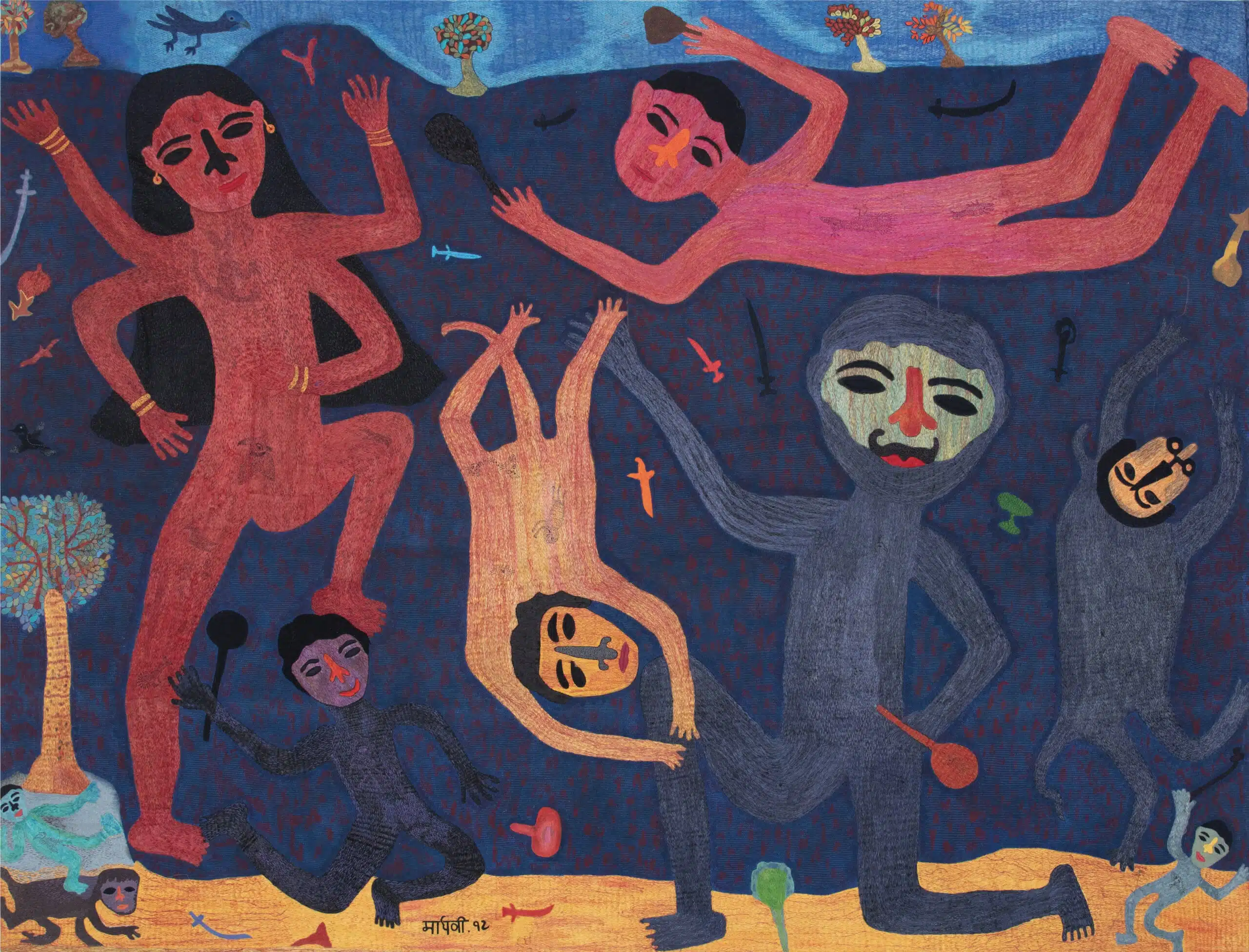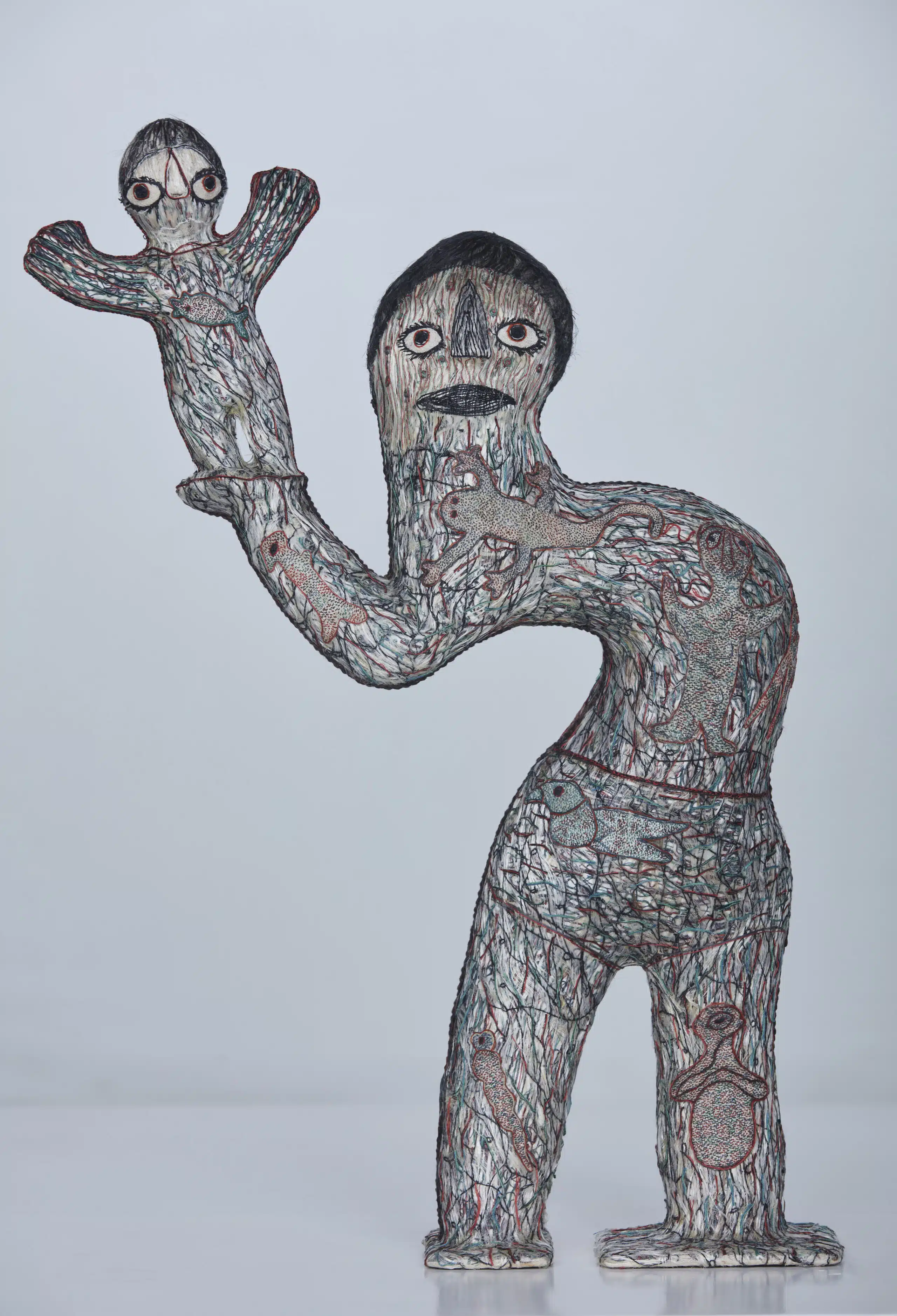 Top: Madhvi Parekh, Karishma Swali & Chanakya School of Craft, Father & Son, 2023, Paper mache, organic jute, linen and cotton thread, 55 X 18 X 76 cm , Photo by Adner Fernandes and Courtesy of the Chanakya Foundation; Bottom: Madhvi Parekh, Karishma Swali & Chanakya School of Craft, Devi & Asura, 2023, Organic jute, cotton, linen and raw silk thread on cotton textile, 286 x 340 cm, Photo by Ryan Martis and Courtesy of the Chanakya Foundation.