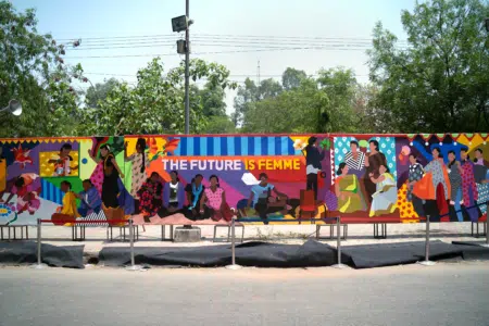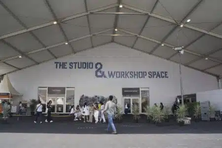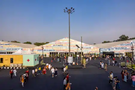 From the planning stages to the execution of the fair, Sustainability remains a priority for the fair. The foundation and base structure of the exhibition tents are reused by events taking place before and after the fair with wooden platforming and booth walls also used year on year. With sustainability as a key thread and focus, the fair façade created by artist Anshuka Mahapatra supported by an open call led in partnership with The Gujral Foundation will be sent to a processing unit in Delhi where it will be repurposed into roofs for urban shelters and upcycled products such as bags, folders, mats and flex pouches for sanitary napkins. In the coming editions, India Art Fair plans to replace the flex which is used for branding and signage with fabric and canvas.