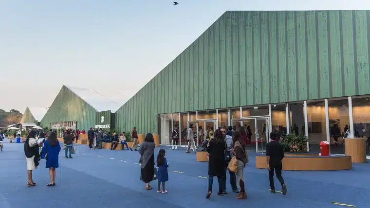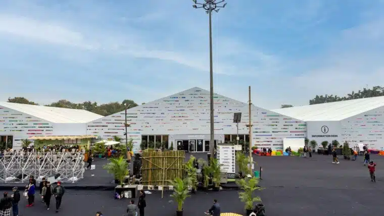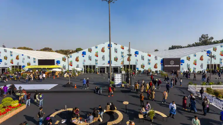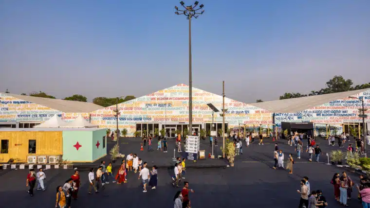 From the planning stages to the execution of the fair, Sustainability remains a priority for the fair. The foundation and base structure of the exhibition tents are reused by events taking place before and after the fair with wooden platforming and booth walls also used year on year. With sustainability as a key thread and focus, the fair façade created by artists and sibling-duo Vayeda Brothers will be sent to a processing unit in Delhi where it will be repurposed into roofs for urban shelters and upcycled products such as bags, folders, mats and flex pouches for sanitary napkins. In the coming editions, India Art Fair plans to replace the flex which is used for branding and signage with fabric and canvas.