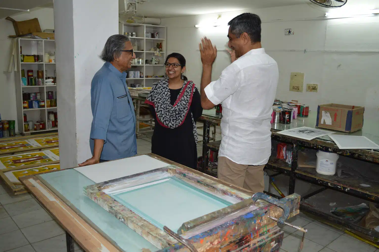 I had some difficulties with Archer in the beginning with serigraphy not being a widely recognised artistic medium at the time and so I started working on commercial jobs for clients ranging from Reliance to Amul and the Institute of Rural Management who required screen printing. This move made Archer an overnight success and in 1988 architect B.V. Doshi came to the studio to get his serigraphs printed and was thrilled with the results. Later, in the early 1990s, he introduced me to the great M.F. Husain, who visited the studio to create a large serigraph while on a visit to Ahmedabad to work with Doshi on the now famous underground art gallery, Amdavad ni Gufa.