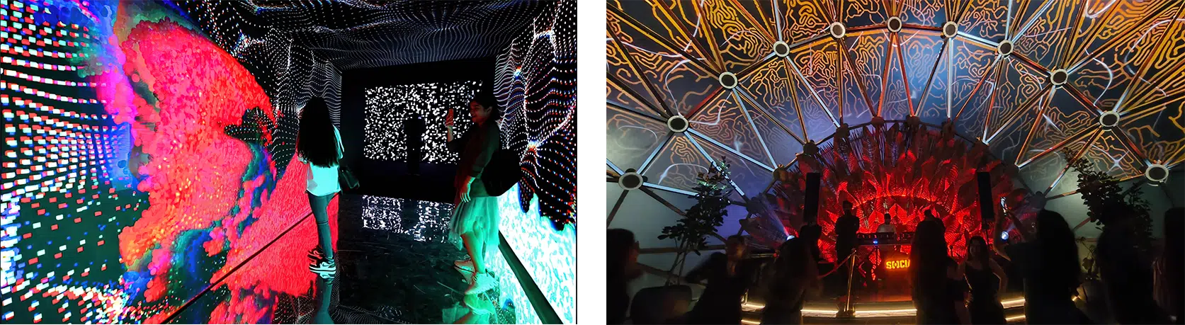 An immersive art experience at India’s biggest metaverse summit, Namastey NFT. Image courtesy of Ameen Abdullah / A permanent AI-powered projection mapping experience for SOCIAL’s terrarium-themed outlet in Bellandur. Image courtesy of Yash Chandak.