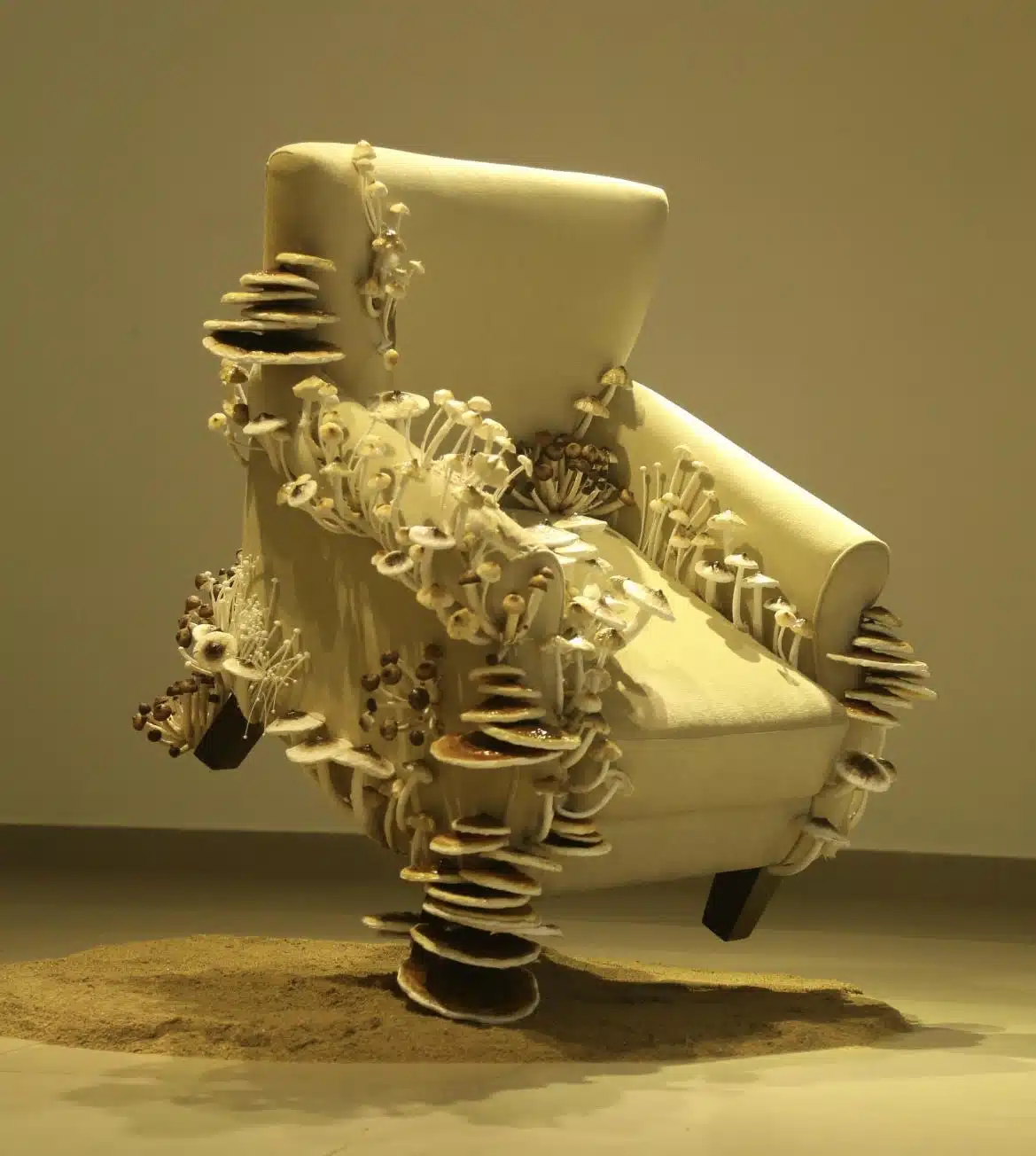 The broken materials in her work act as a fertile ground for new forms– mushrooms emerging from shattered bangles symbolise healing, renewal, and quiet strength.