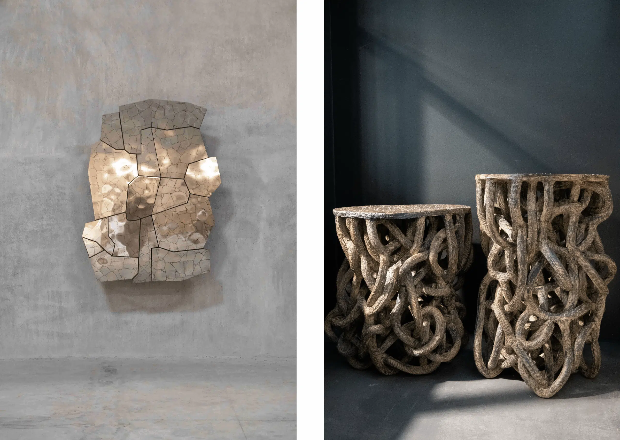 SHIFTING HORIZONS FEATURES A WIDE RANGE OF WORK — FROM REFLECTIVE METAL SCULPTURES FROM NITUSH AND AROOSH TO HANDWOVEN TEXTILES ON MINIMALIST FURNITURE FROM SHIVANGI VASUDEVA, AMONGST OTHER DESIGNERS. LEFT: WORK BY NITUSH AND AROOSH, RIGHT: WORK BY SHIVANGI VASUDEVA; COURTESY OF THE DESIGNERS