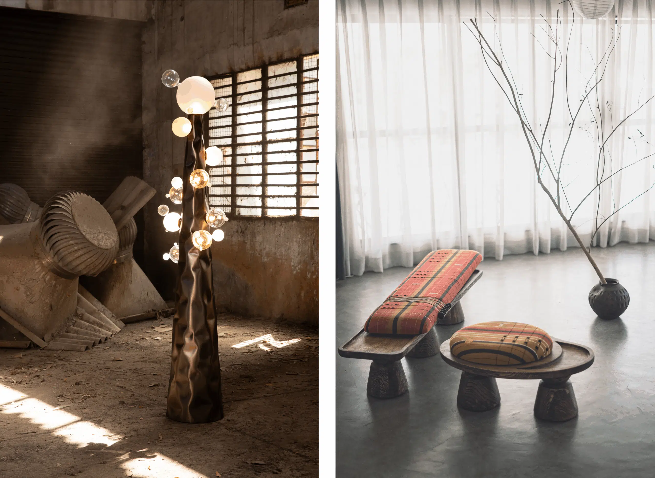 ALAIIA GUJRAL’S VISION FOR DESIGN LIES AT THE CROSSROADS OF HERITAGE AND INNOVATION, WHERE AGE-OLD CRAFTSMANSHIP IS REINVIGORATED WITH MODERN AESTHETICS IN A BALANCE OF FUNCTIONALITY WITH ARTISTRY. LEFT: WORK BY SAGE LIVING; RIGHT: WORK BY SHAROL AHLUWALIA; COURTESY OF THE DESIGNERS