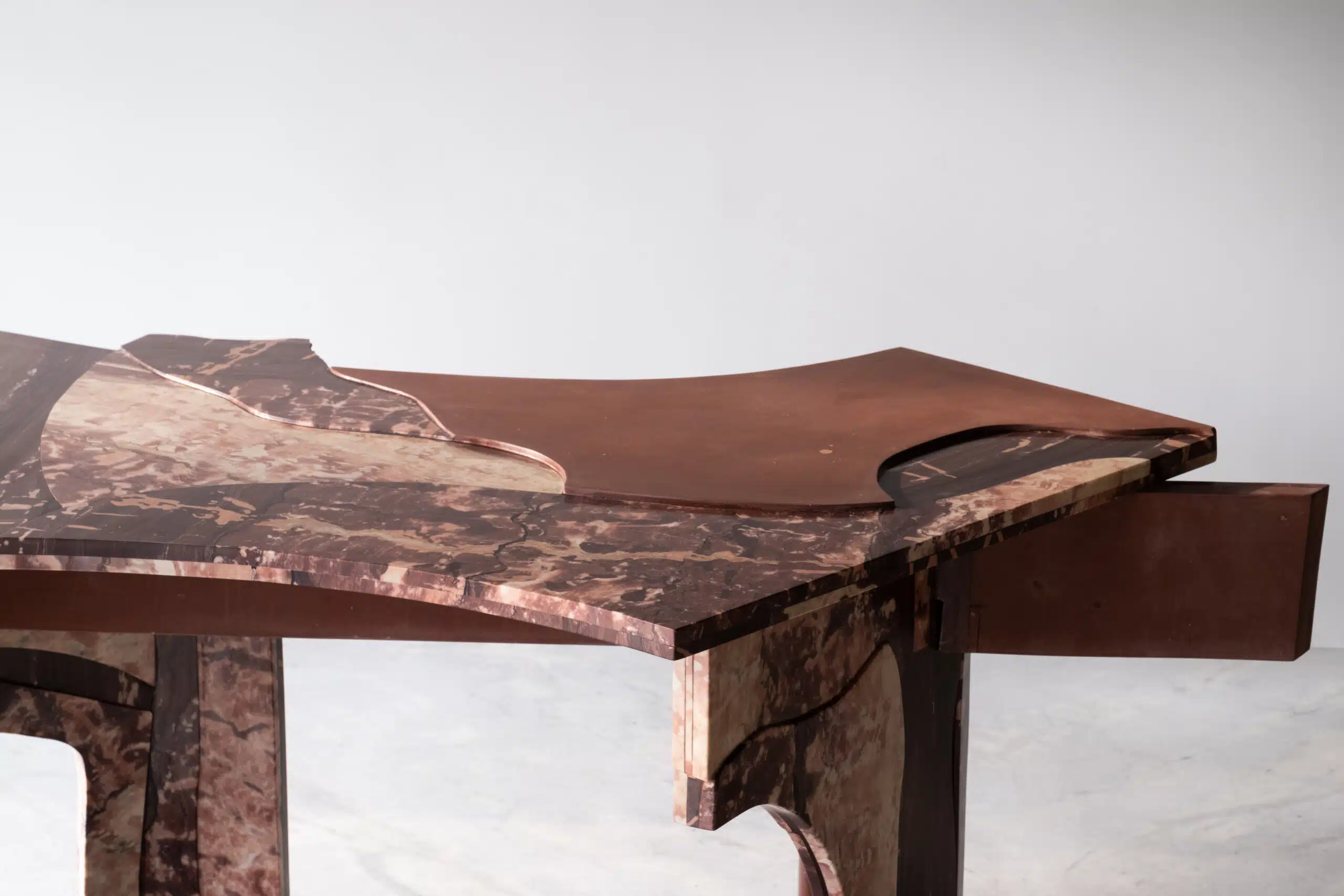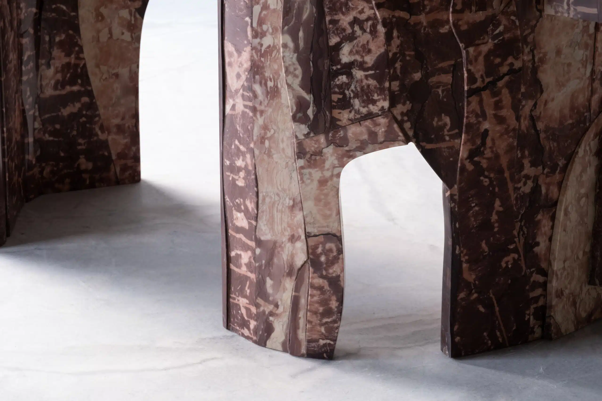 Based between the quarries of Makrana in Rajasthan and the state capital of Jaipur, Studio Raw Material breathes new life into a centuries-old architectural and design staple—marble. In their hands, the usually carved and polished rock gives way to its imperfect fragments, showing the many geologic, cultural and technical histories it can contain. In all their work, the Studio places marble into its regional, ecological and community context in Rajasthan— picking offcut pieces to improvise new forms while working with indigenous joinery techniques. Works in the Studio’s most recent series, Khokhar, composed out of reclaimed marble slabs from architectural sites exemplifies their design philosophy and mirrors the landscape of the quarry itself. Each work is a snapshot of Makrana, a seemingly precarious assemblage of fragments yet strongly rooted to the land and its people.