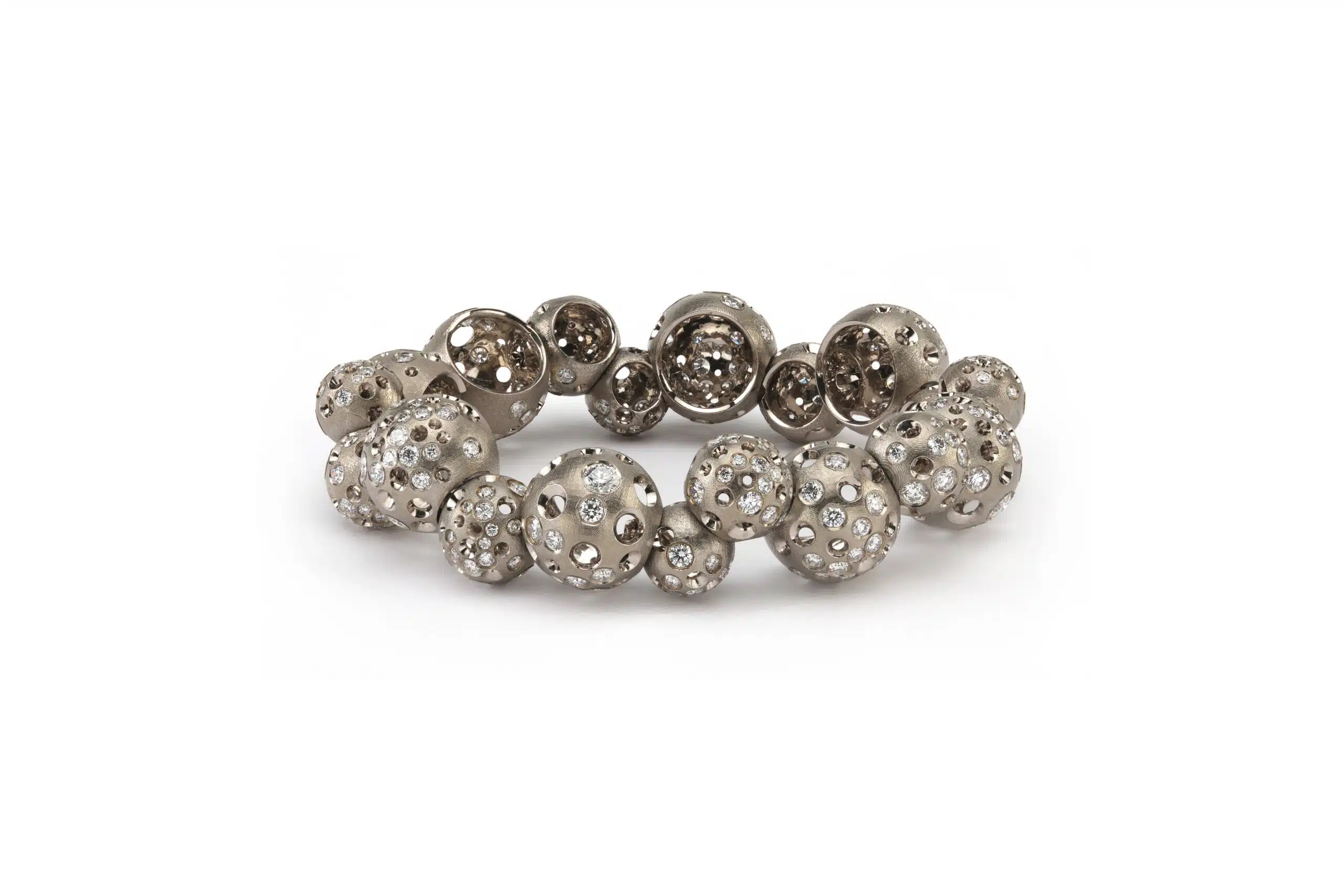 Studio Renn, Puffball Void Sphere Bracelet. 18k Grey Gold set with round diamonds. Courtesy of Studio Renn