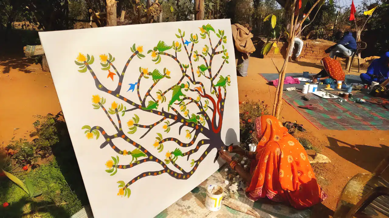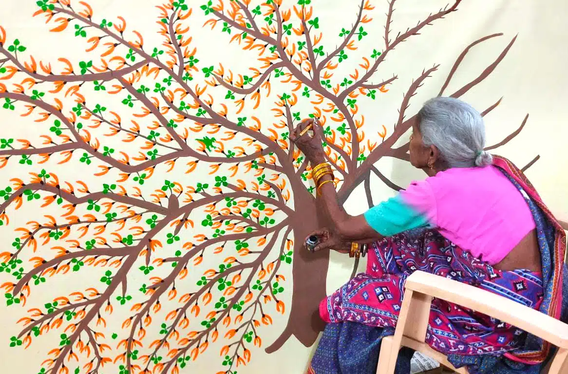 Jodhaiya Bai, a labourer and 69 years old then, had joined Ashishji’s classes along with her family and friends, but it soon became apparent that she possessed an exceptional genius. Luckily, there was someone there to help her release the latent talent within. “Painting takes me to another world where I am as free as a bird,” she told Ashishji. “When I learned about a teacher who was willing to teach for free in our village, I decided to give painting a try, something I was never interested in. Yet, on the very first day, I found my passion.”