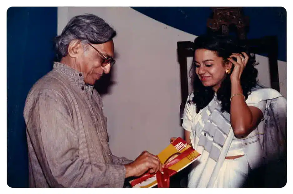Top to bottom: Sangita Jindal with the artist Tyeb Mehta, and with Anupa Mehta and Shanta Gokhale during the release of the first issue of ART India. 1996. Anupa Mehta was the first Editor of ART India and Shanta Gokhale was part of the Editorial Advisory Committee. Courtesy of JSW Foundation