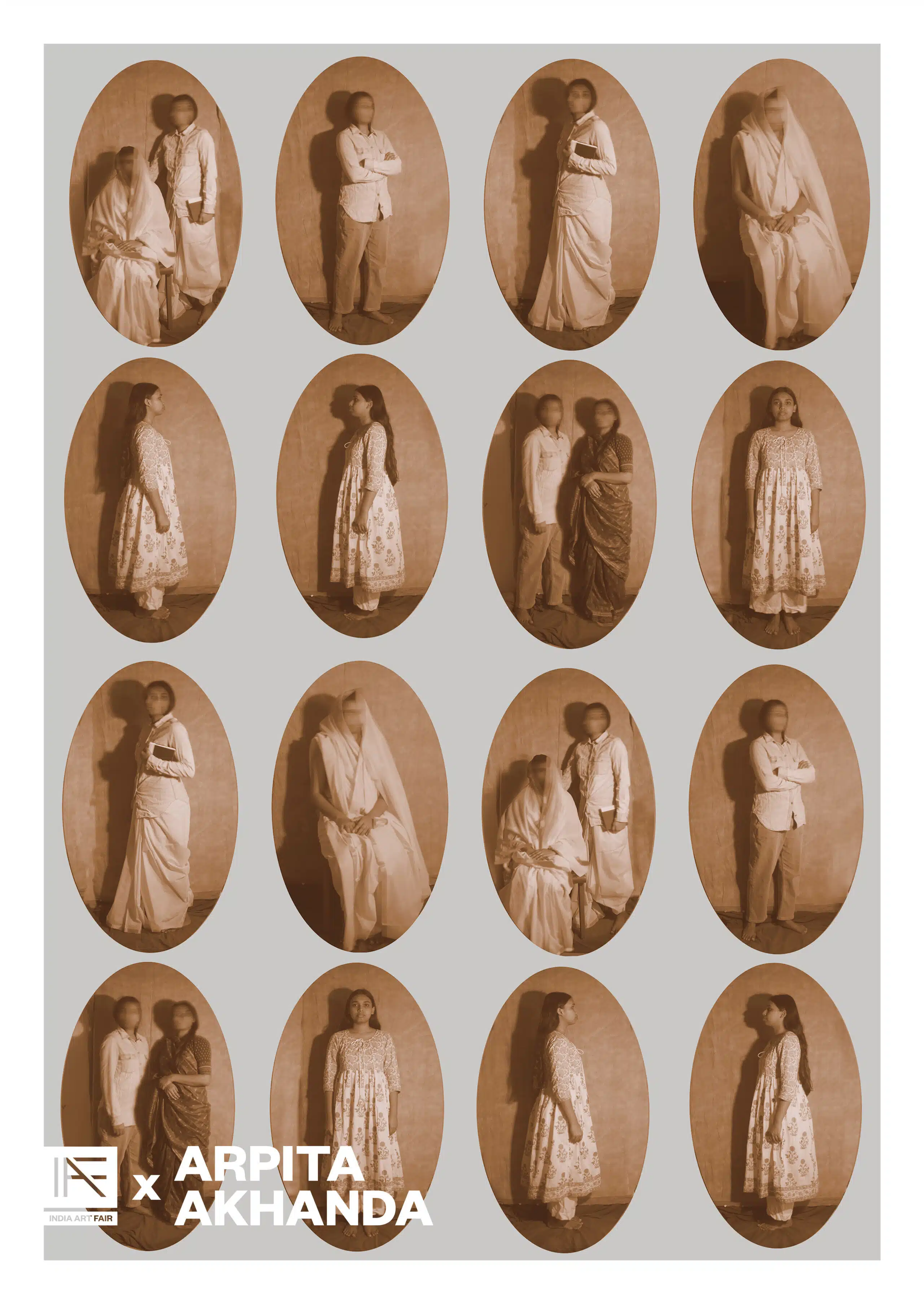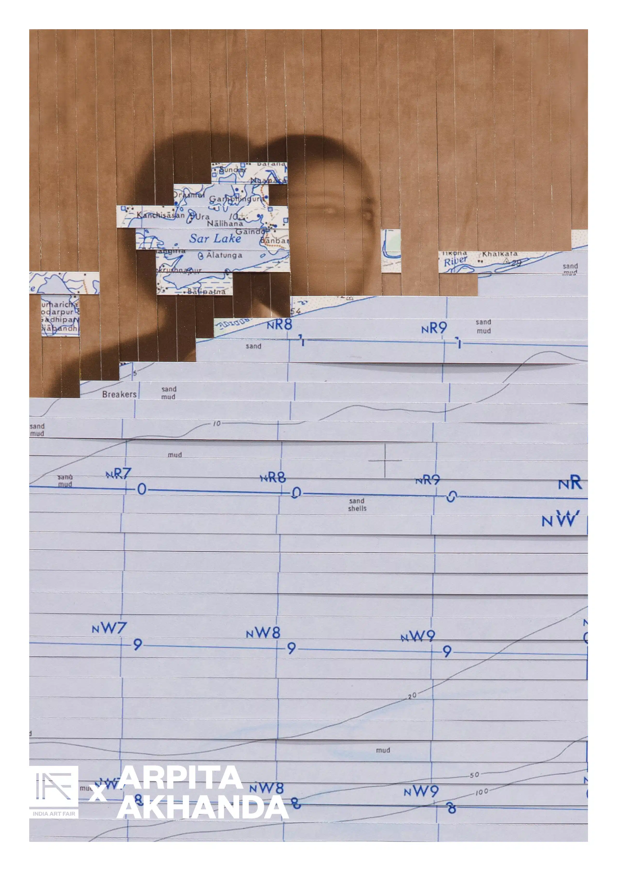 Arpita Akhanda works at her apartment-studio in Shantiniketan in West Bengal, India. Her artist poster features excerpts from her recent performative photographic series exploring the relationship between a river and body.