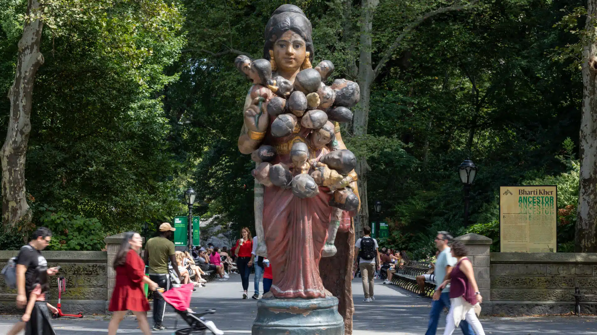 Public Art Fund presents Ancestor, an 18-foot-tall patinated bronze sculpture by Bharti Kher. Depicting a universal mother figure linking our cultural and personal pasts and futures, Ancestor is Kher’s most ambitious work to date. Brought to life at a monumental scale, the sculpture is adorned with the heads of her 23 children that extend from her body, she embodies multiculturalism, pluralism, and interconnectedness. They manifest a sense of belonging and celebrate the mother as a keeper of wisdom and the eternal source of creation and refuge. The impactful sculpture is on view at the southeast entrance to Central Park.