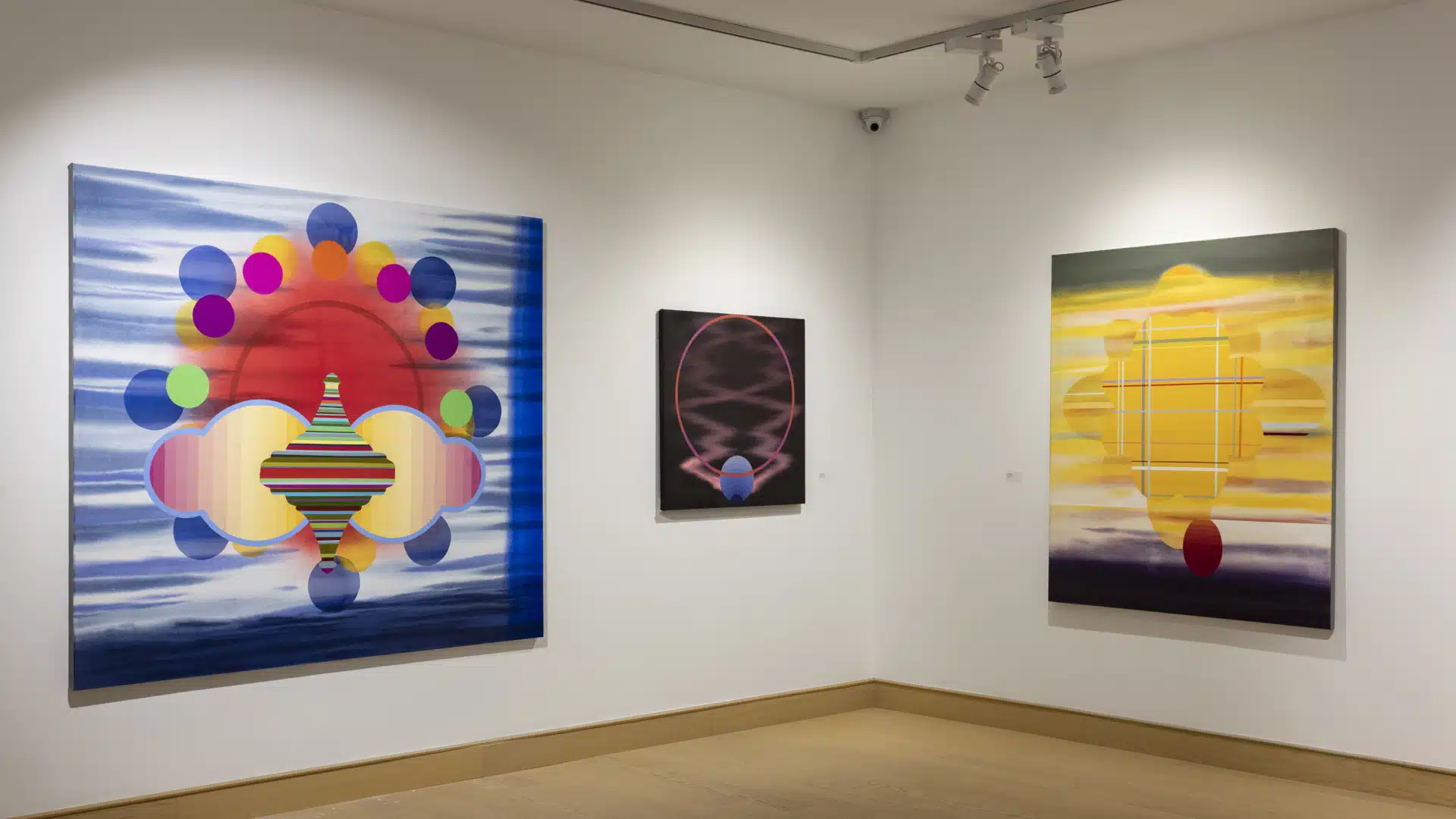 Nature Morte presents a solo exhibition of paintings by the American artist Stephen Mueller titled Atmospheric Paintings. Born in Norfolk, Virginia, USA, Stephen Mueller (1947-2011) was an artist, writer and educator who lived and worked in New York. Atmospheric Paintings is the third exhibition presented by Nature Morte including works by Stephen Mueller. On view are nine paintings employing polychromatic patterns and geometry, with elements suspended in space. The works evoke Mueller’s interest in spiritual and mythological ideologies and painting from the Indian subcontinent, specifically that of tantric Buddhism and Pahari miniatures. Symmetry is colligated with ambiguity, hard-edged structures are superimposed on fluidity. For Mueller, the works express ‘the folly of duality, the falsity of the idea of self’, echoing the notion of transience integral to Buddhist philosophy.