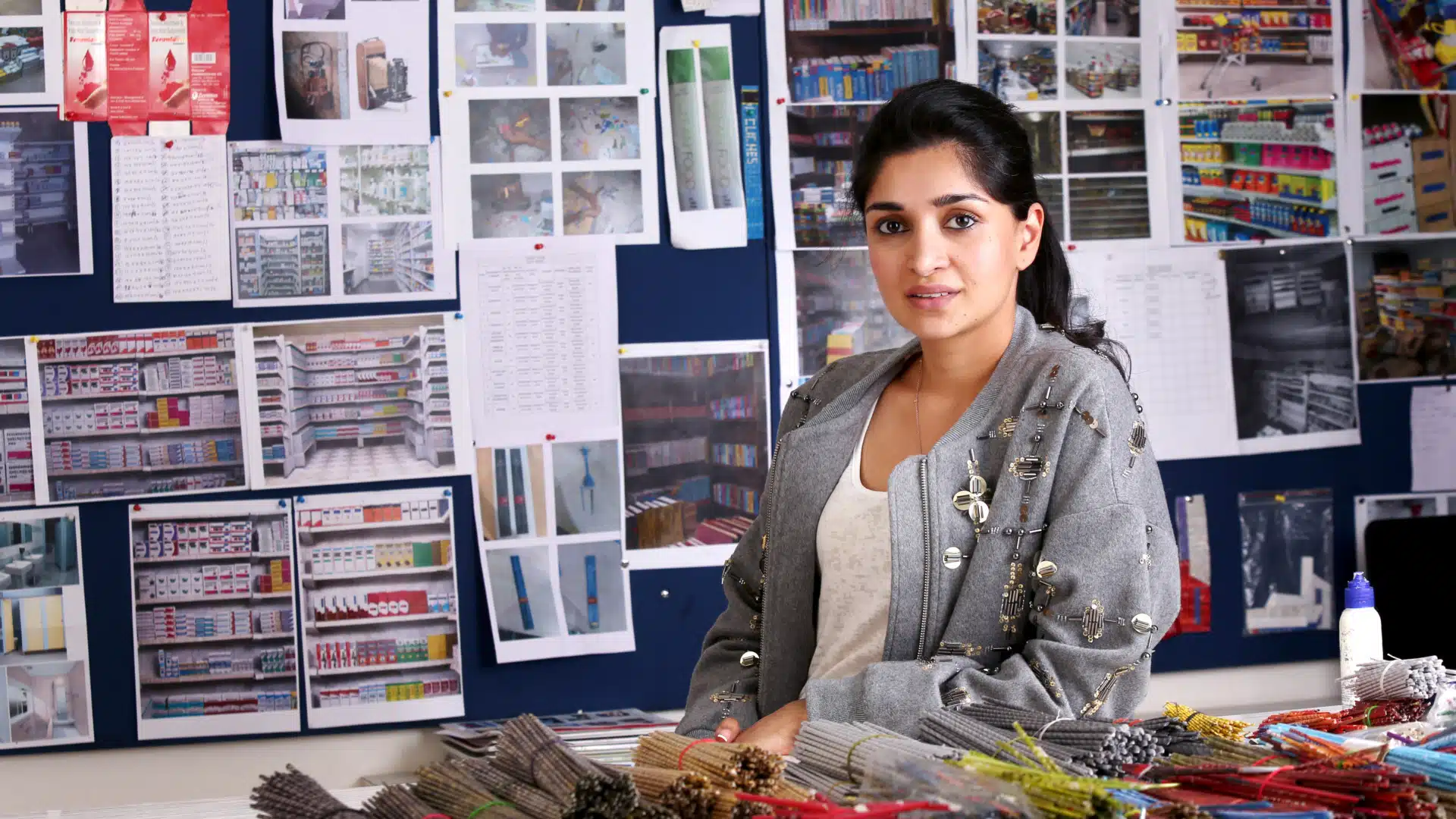 Trained at Parsons in New York and Central Saint Martins in London, the artist now lives and works in Hyderabad, where she creates intricate sets of spaces like movie theatres, bookshops and grocery stores, with an aim to capture private moments in public spaces.