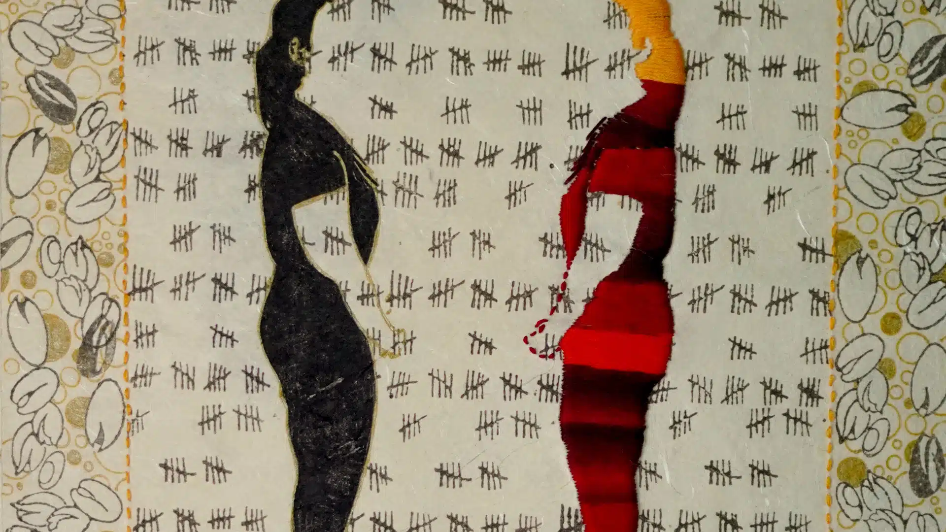 The exhibition brings to the forefront the importance of the paradox of repair and decay of the human body. By reflecting on her own physical and emotional journey through breast cancer, Sunaina Bhalla draws on her autobiographical power of healing and the colours of Ayurvedic remedies. Handmade paper with golden turmeric hues creates a tensile strength, resembling taught skin, stretched over the surface of a light box. Like an x-ray image, we see fibrous thread-like structures and nerve endings pierced with needles, stitched in red and gold to signify the trauma and hope the body holds. Fragile, delicate lines hold their position like lightning bolts across the layers: the scars of time. The show also includes a collaborative quilt, hand-made by the women workforce of Thotpot, a not-for-profit organisation based in Mumbai, and designed by founder Tapan Mittal-Deshpande and Bhalla.