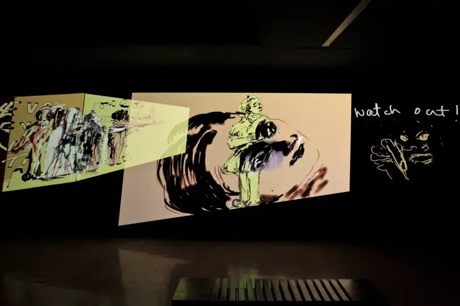 Can You Hear Me?, the artist’s first UK commission, comprises 88 animations projected on the walls of the Whitechapel Gallery’s historic interior. Made between 2017 and 2020, they feature overlapping hand-drawn images and notes, as well as fragments of quoted text. In this installation Malani once more fills the former central reading room of the Whitechapel Public Library with books, transcribing quotes by influential writers such as Hannah Arendt, James Baldwin, Bertolt Brecht, Veena Das, Faiz Ahmad Faiz, Milan Kundera, George Orwell and Wislawa Szymborska. This 21st century form of the artist’s notebook is projected directly onto the gallery’s brick walls with text and image taking the form of moving graffiti.