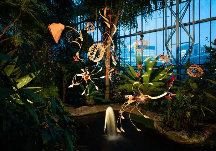 Cloud songs on the horizon by Ranjani Shettar is a five part installation commissioned specifically for the Barbican’s Conservatory in partnership with Kiran Nadar Museum of Art (KNMA). The installation comprises five sculptures, handcrafted by Shettar in her studio in rural Karnataka, India, which will be suspended throughout the entirety of the Conservatory’s 23,000 square foot space. A tropical oasis in the heart of London, the Barbican Conservatory is home to a vibrant mix of 1,500 species of plants and trees from across the world.