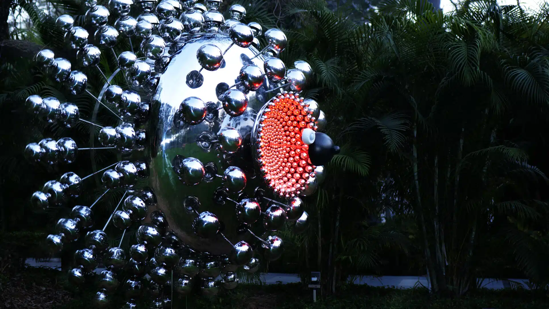 A mesmerising stainless steel kinetic sculpture, Shovin Bhattacharjee’s Cosmic Eye can seem like an eye, the sun, a wheel, a globe or even the cosmos, depending on where you stand. A rotating wheel at its core grounds the work, evoking notions of natural cycles and the continuous movement of planets and stars in the universe. Signifying hope, harmony and progress through a meditative and spiritual artistic vocabulary, the sculpture encourages a moment of contemplation and reconnection with our life-force in the midst of the hustle and bustle of life.
