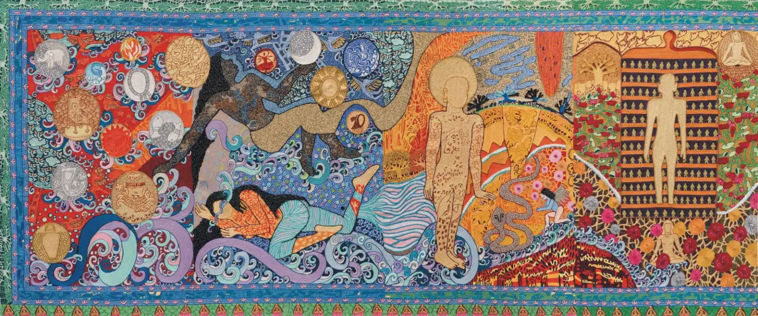 The project will consist of 15 artworks embroidered with silk and cotton threads, beads, and sequins on an untreated canvas cloth. There will be three paintings in acrylics with gold and silver leaf on canvas; as well as two works on gold tissue procured from Banaras that bring together painting and embroidery. Apart from this there will also be a multidimensional performance that brings together animation, music, poetry, and movement.