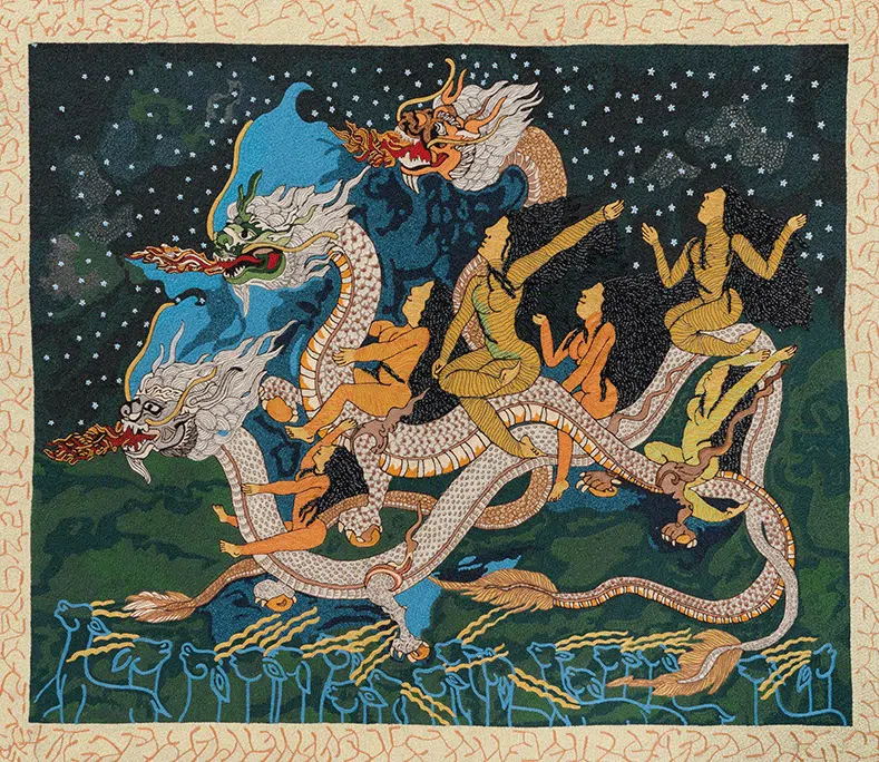 The project consists of cloth artworks, embroidered with silk and cotton threads, beads, and sequins on untreated canvas. The series coalesces around the very material experience of human physicality, playing with the presence of the human body not just through subject matter and motif but also through the labour intensive hand-techniques of weaving and stitching. Together, the entire assemblage celebrates the nuances of life, playfully exploring different pathways to reach nirvana, the final liberation.