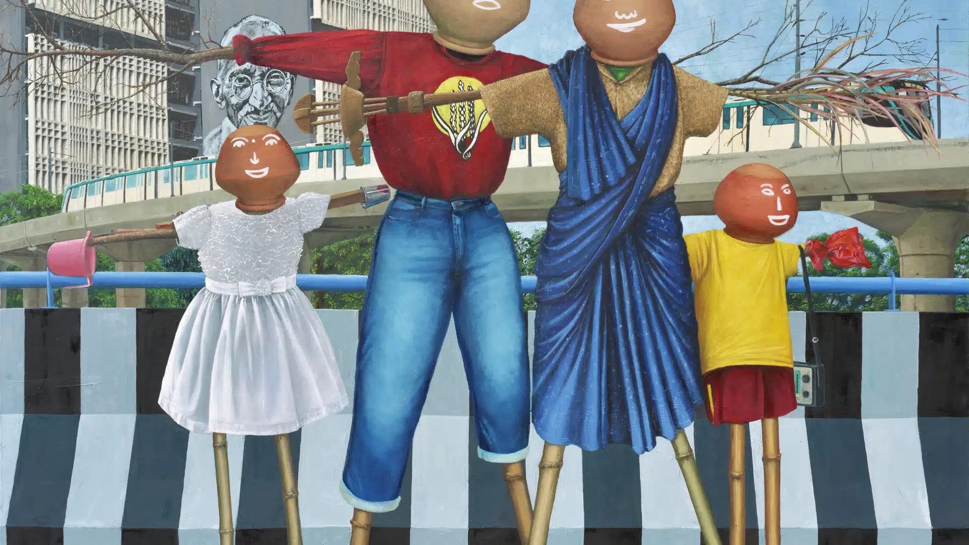 Reji’s works are known for their witty take on the state machinery and its multiple modes of ordering of lives of people. In this recent body of works, he takes a new direction in exploring this. The meticulously constructed canvases offer a newer language, and furthermore, newer narratives. Drawing references from the popular ‘scenic’ images, some of the works in this exhibition ruminate on the question of decoration. A central theme these works interrogate is the policing (order) of the natural, the cultural and the intimate spaces and the infrastructural logic of surveillance.
