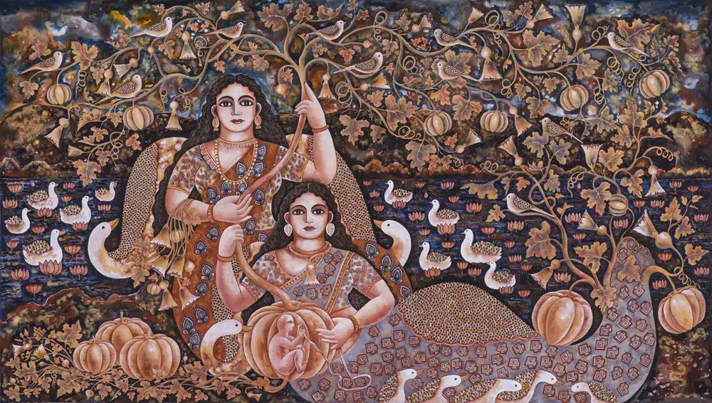 Art Musings is delighted to present Dhārā, bringing together recent works by renowned artist Jayasri Burman. This exhibition features a set of ideas that has absorbed Burman over the last several years: Birth, Nature, the Sacred Feminine. Fables and folk tales from her childhood creep into the narrative, which is full of myth and magic, rituals and festivals. She invests in the archetypal figure of the Great Mother, manifested as the Devi, the guardian of waters both still and flowing, attended by animals symbolically associated with fertility and plenitude. Her paintings have an altar-like quality, and depict Nature as divinity.