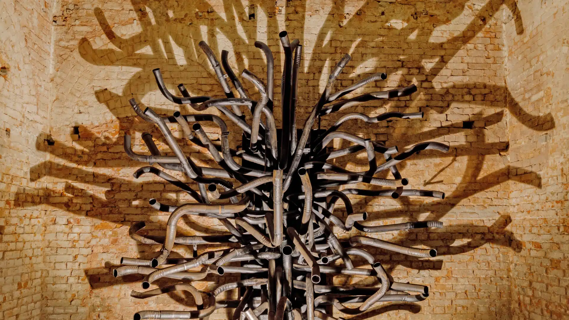 Arts Ananda Trust presents a large and intricately constructed sculpture is made of scrap silencer pipes from trucks by Narayan Sinha. Created and assembled during the pandemic, the tangled nature of the sculpture evokes the dark smoke and challenges of the past year, while showing us the balance and harmony which is ever-present in nature.