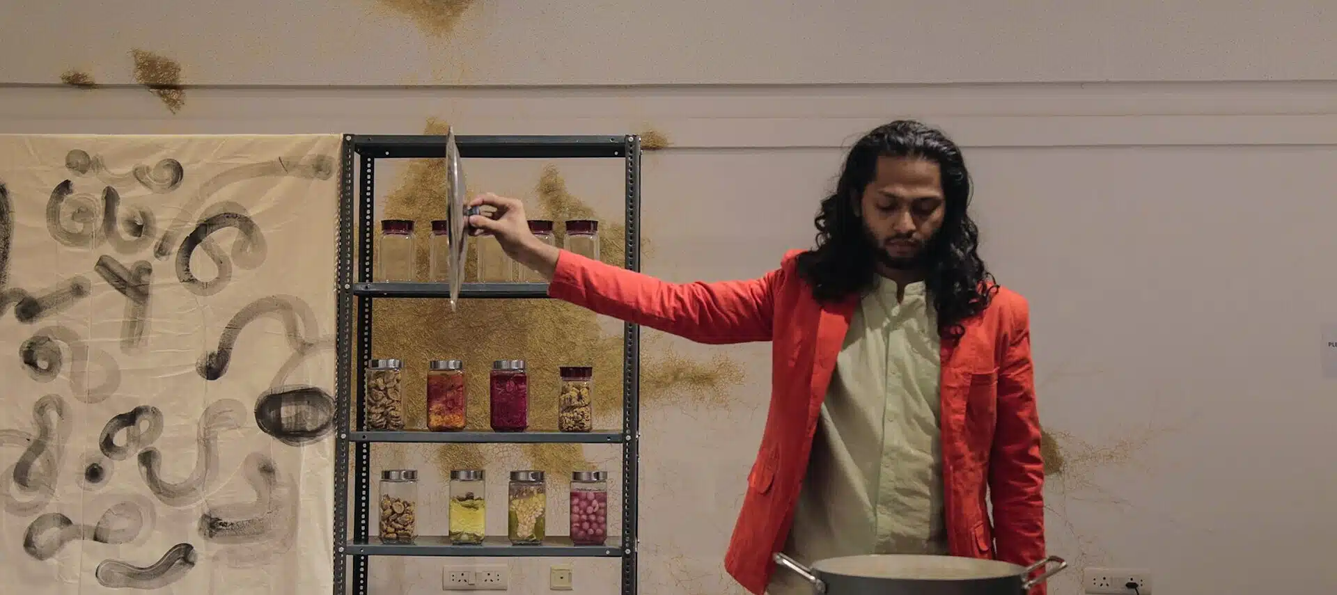 The artist stages adapted rituals and invokes hillocks of porous red rocks and imaginary vessels in the performative space to draw lores of human bodies and cash crops, right out of the mountains of the Western Ghats.