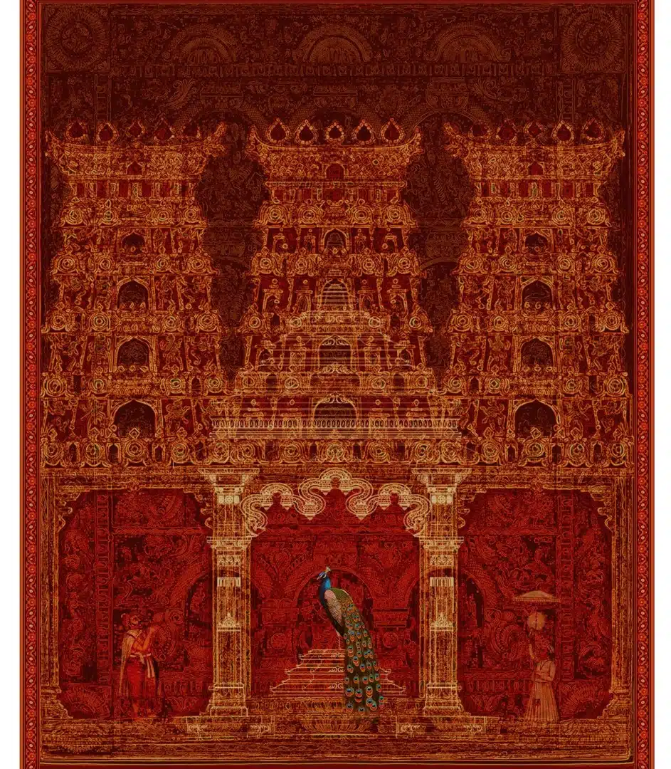 Keerti Pooja’s works revolve around people in the bazaars. Her fascination with their daily jobs makes her romanticize and depict delicate details of their hands enlarged to draw the viewer’s gaze to the people engaged in mundane chores. Srinivas Pulagam’s works delve into the histories of ancient India and architectural elements of the temple structures of Hindu pantheons. In juxtaposition of histories, biographies, and in a continuum of traditions these artists with their own memories weave the garlands of imaginative worlds to construct visuals reflective of the suburban backgrounds and present-day practices.