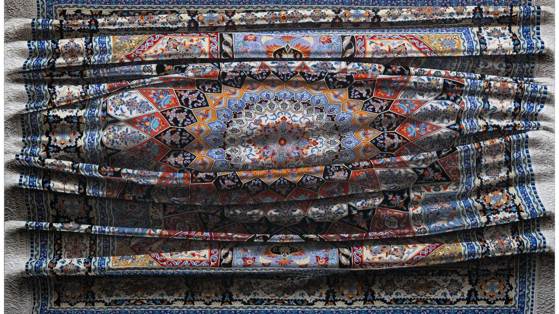Known for his hyper-realistic, dramatic paintings depicting skillfully executed ornamental tapestries, Santin’s paintings including his earlier, large series of portraits seem to be the results of the forces of light and dark, of the visible and the hidden. Similar to the techniques of tenebrism and chiaroscuro that the master painters such as Caravaggio and da Vinci introduced to European painting in the 15th and 16th century, Santin is able to depict dramatic scenarios, not only of human expression but even of textile folds the latter with a humorous lightness.