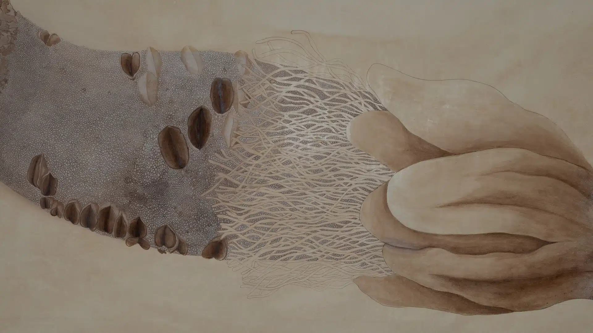to the subcontinent but were brought to the Indian shores hundreds of years ago through ancient trade routes, Western Colonialism, or even just floating naturally in the sea. In painting delicate filaments, petals, and seed pods, Gopa looks to the botanical gardens of the 18th and 19th centuries that were once centres of imperial exploration and addresses their implications as a political tool, to in turn inquire into the act of othering and belonging, especially within the current politico-cultural landscape.