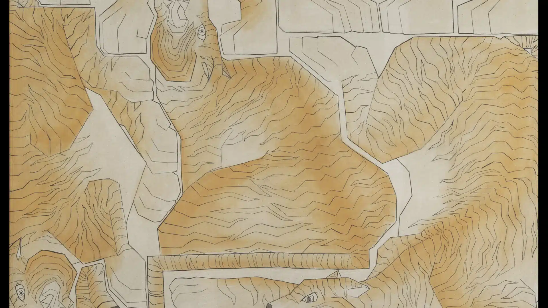 Zimbiri continues to employ traditional techniques from Bhutan in her new body of work. On view will be paintings, all rendered using the natural colours of Saa-tshen (pigmented earth) on Rhay-shing (hand-woven canvas). She revisits her familiar subject of the tiger, furthering transforming it into abstractions containing the ferocious tigers, constricting and conforming their energies into box-like formations. She then fragments, shatters, superimposes, warps, distorts and juxtaposes these magnificent beasts with their iconic stripes.