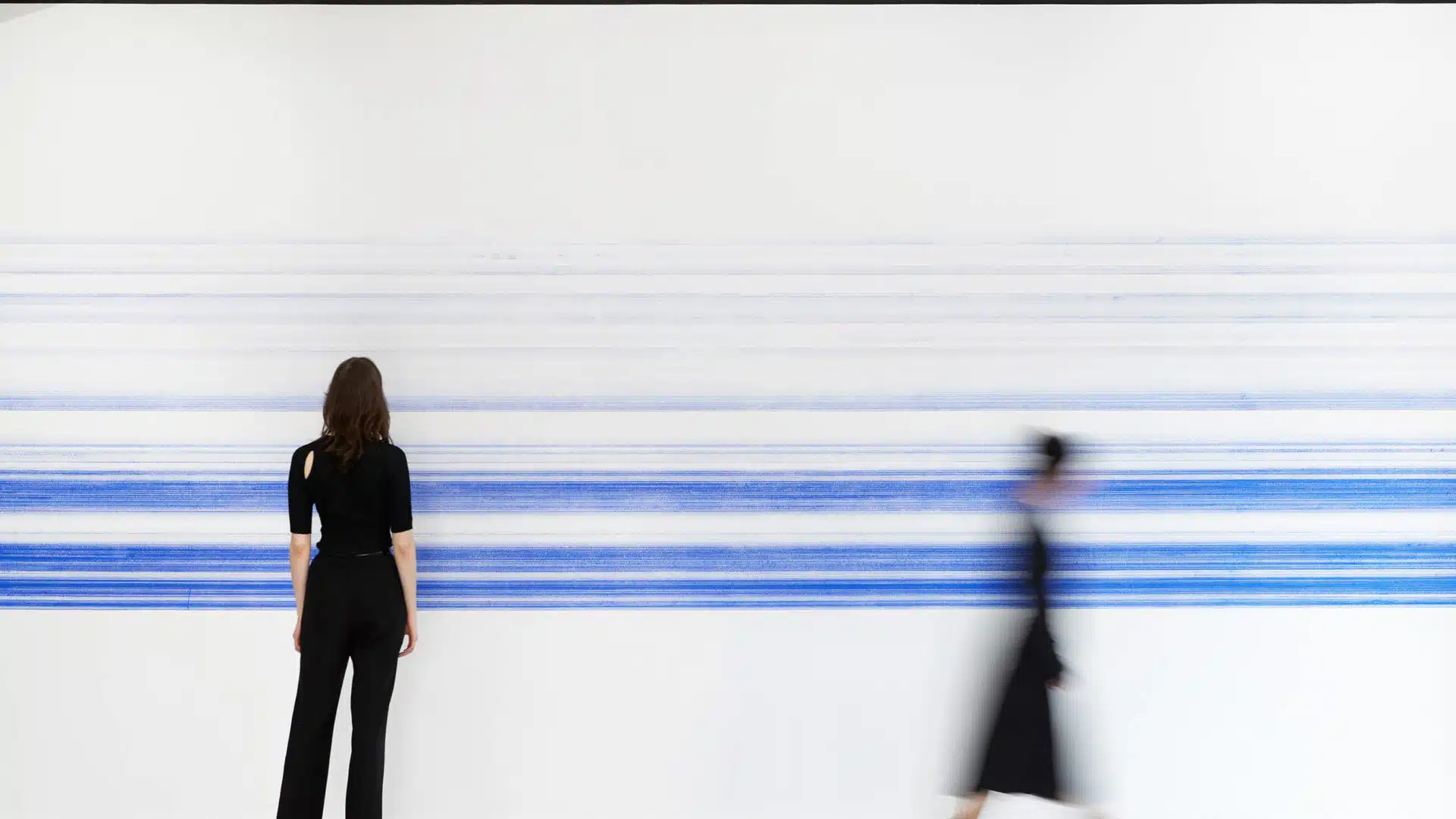 Tanya Goel presents a neel pigment wall drawing as a solo project outside the VIP Lounge. A site-specific construction set against a finely drawn grid, the work is made by dipping a series of threads into coloured chalk, a process often associated with architects who use these temporary lines to site future constructions.