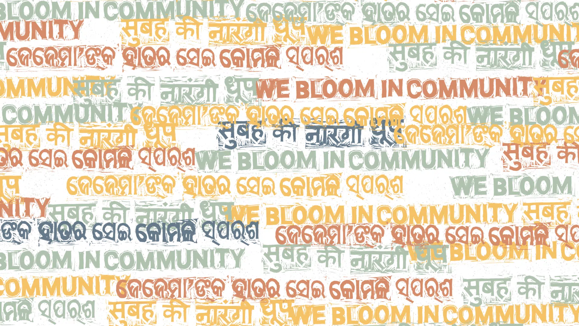 The India Art Fair Facade is created by artist Anshuka Mahapatra and celebrates the ideas of hope, love, life and togetherness. Using poetic phrases in seven regional Indian languages, including Odia, Assamese, Kannada, Hindi, Gujarati, Malayalam and English, the artist brings to mind fleeting and evocative moments of beauty from everyday life. The artist, whose practice is rooted in printmaking, was selected to design the fair facade through an open call led in collaboration with the Gujral Foundation and Artdemic.