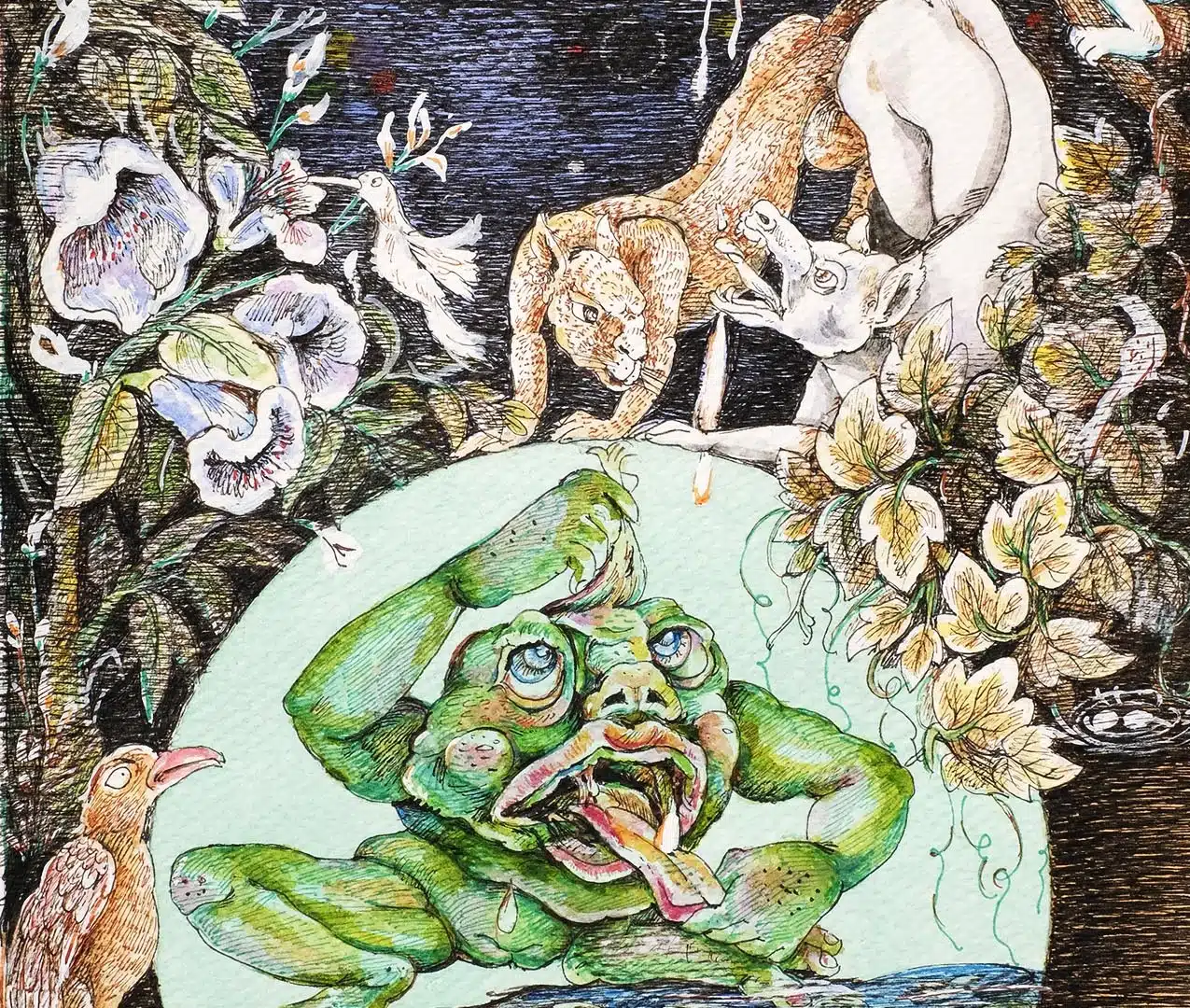 The artist imagines a pastoral time, the onlooker’s attention cannot waiver, as there are hidden characters lurking in these lush landscapes to be discovered. Concealed carefully within the profuse exotic flora, an idyllic charm of contemporary context is minutely placed, through imagined landscapes with unreal animals, various human figures, or sometimes fusing them with objects.