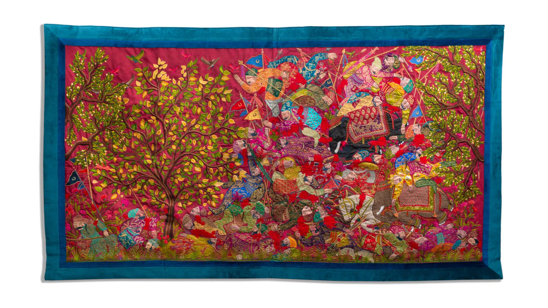 Aicon Contemporary presents a solo show of works by Adeela Suleman, Mercy Shall Follow Me. Adeela Suleman continues her fascination with violence, especially lethal violence, in this show. A lifetime based in Karachi, Pakistan, evokes days spent agonizing a safe route to routine destinations, the ramifications of a child or partner who is late and unreachable, and other circumstances which would not typically warrant unease in another setting. The artist transposes these turbulent moments of her life and those of others into works of art. The act of creating applique work is a process of recording history, layer upon layer, embedding experiences, atrocities, violence, love, pleasure, and death to unfold a story.