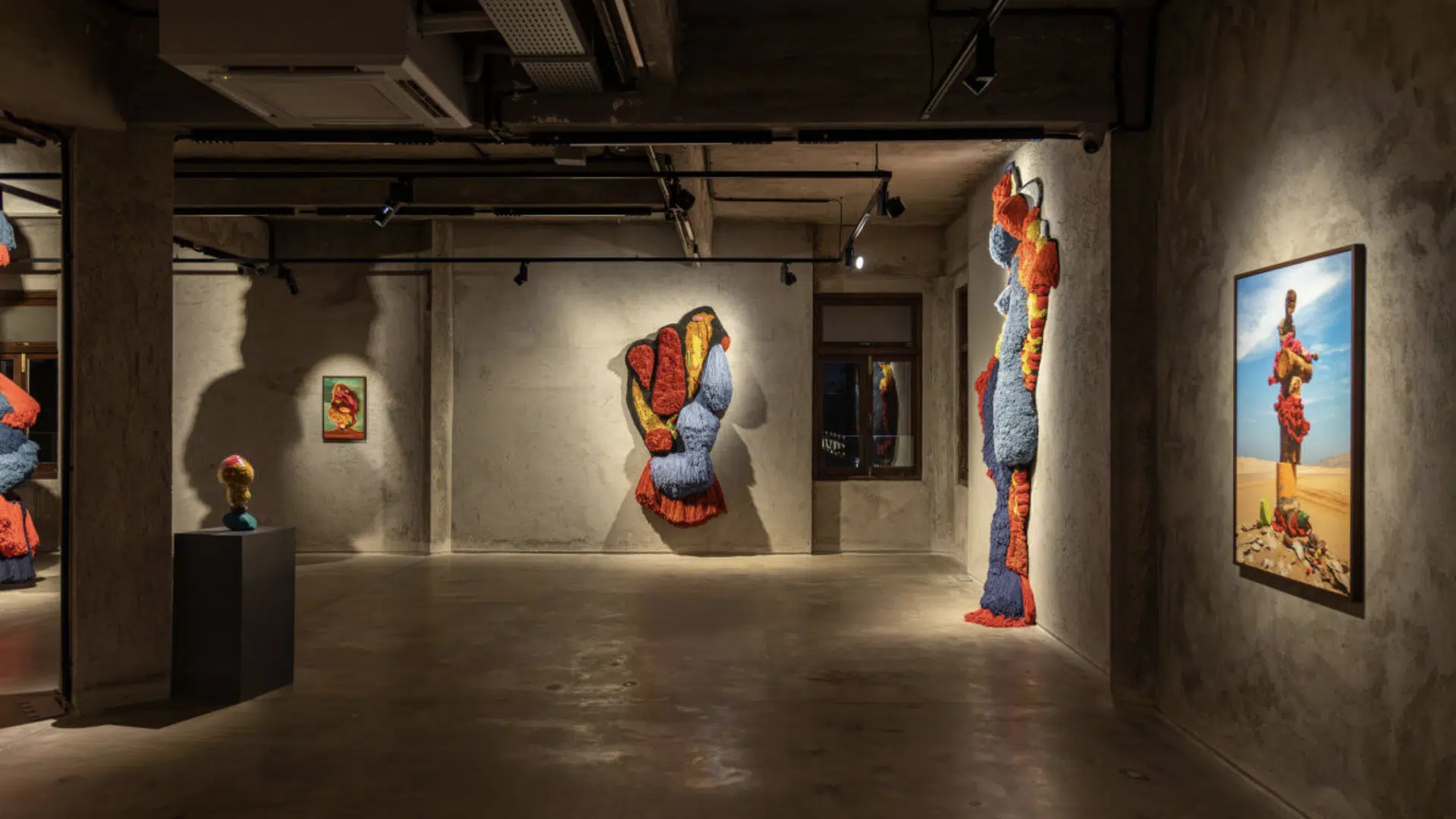 The exhibition features gigantic soft sculptures floating from above as well as small and delicate still-lifes containing fractal patterns and geometries. These particular works trace back to the artist’s biographical roots in Italy and Peru, while unveiling the result of collaborations with artisans in Murano, Italy, at the Jaipur Rug Foundation in India, and indigenous communities in Chinchero, Peru.