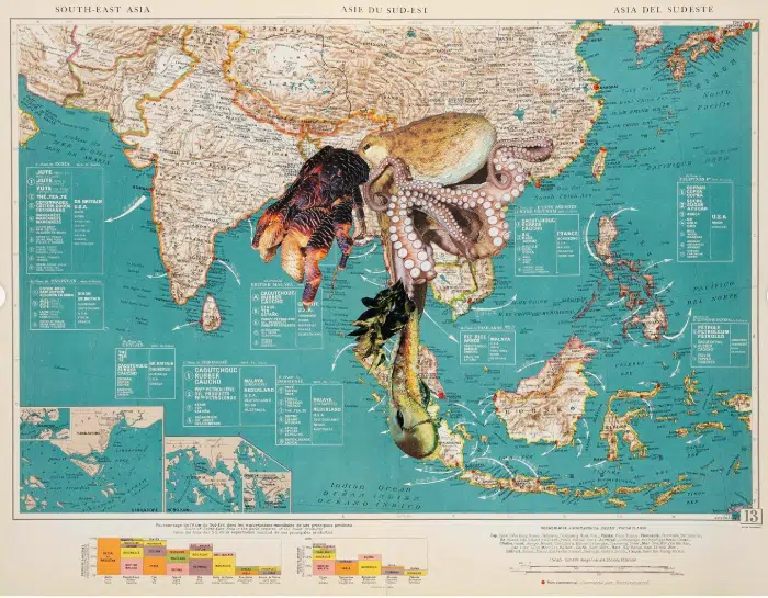 Building on their series, Appropriation Disinformation- Nature and the Body Politic², Makanji negotiates with the artificial notions of ownership of natural resources through political borders by using historical maps, overlayed with collaged organisms. They see maps as cartographies of conquest, that do not reflect reality, nature, vulnerability, other species or terrain. Here, Makanji also looks at the altered migration patterns of species driven by climate change, highlighting the interconnectedness of these issues. The idea is to subvert maps as colonial instruments of extraction by covering them with the very subjects that they precisely lack or only display in words or numbers.