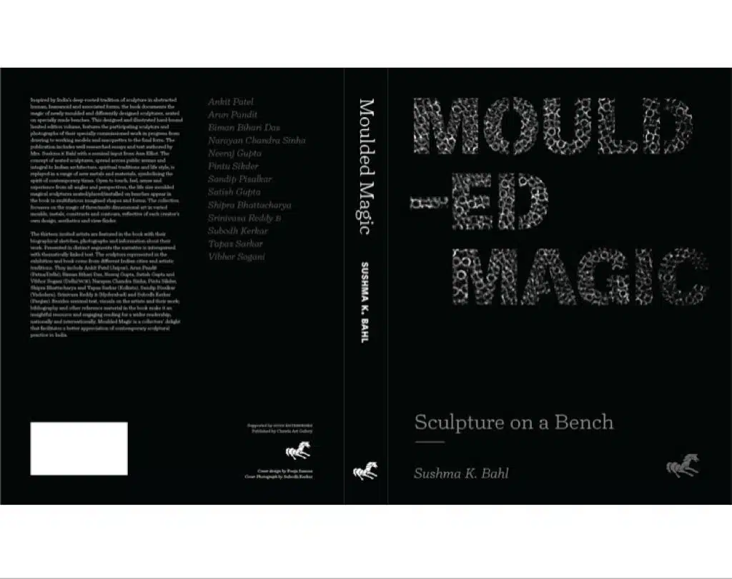 Published by Chawla Art Gallery, Moulded Magic: Sculpture on a Bench is a limited-edition book by Sushma K. Bahl that documents India’s long standing practice of sculpture staged on benches through works by thirteen artists including Narayan Chandra Sinha, Pintu Sikder, Satish Gupta and Vibhor Sogani, amongst others. Filled with a range of illustrations, visuals and photographs, the book captures the entire creative process, from drawings to working models and maquettes to the final life size sculptures created in various metals in abstracted, human and associated forms.