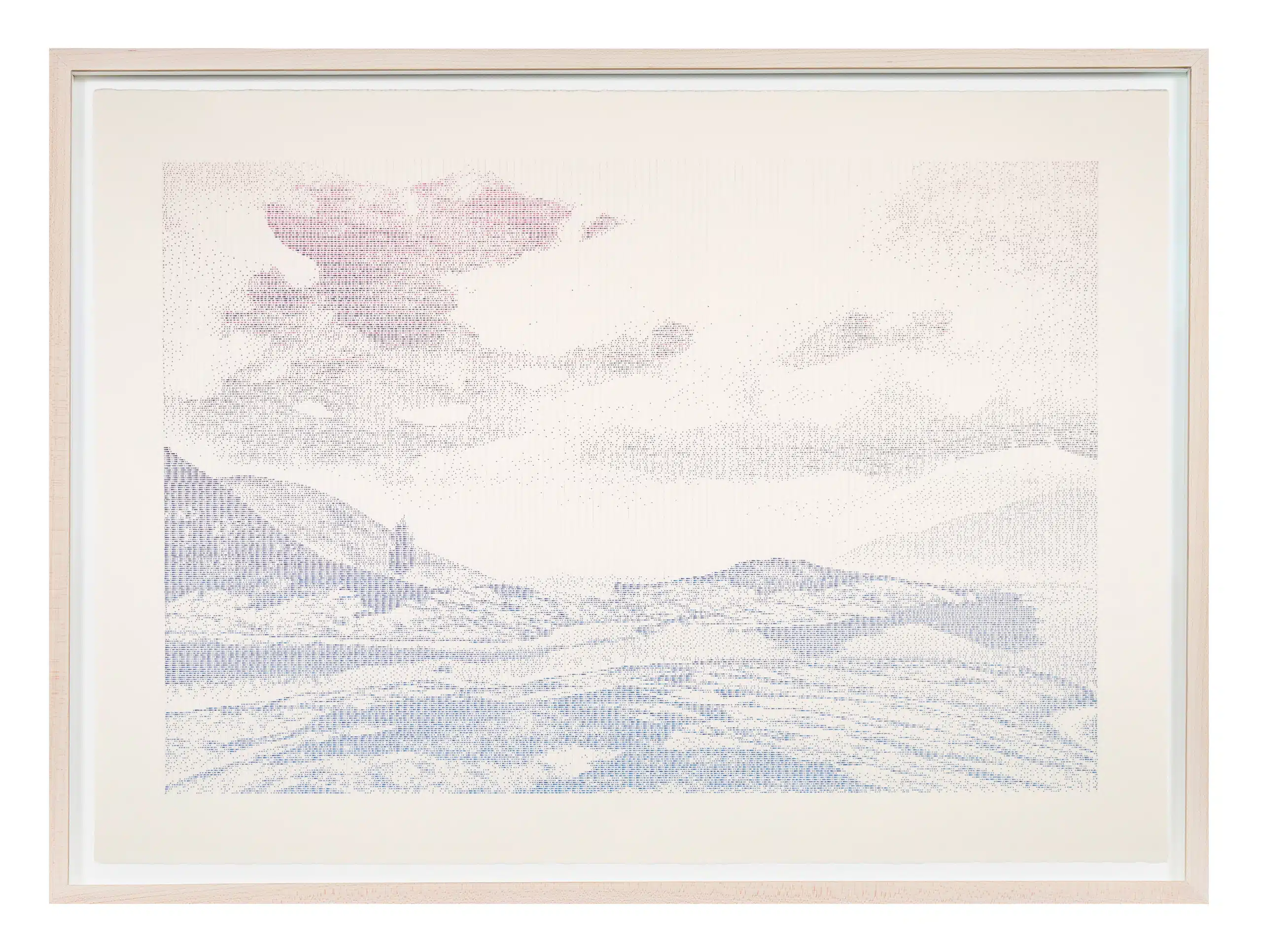 The artist’s aim was to mimic the laborious nature of these highly romanticized landscapes through a digital lens and Malhotra employs his equally intensive signature style to that end. Using Binary and Morse code and line drawings with pen and graphite pencils on archival printmaking paper, Malhotra’s works are a lesson in painstaking precision.