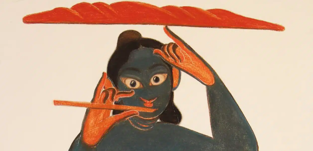 Shine’s Nidhivan is a private pastoral that resides between retelling and reliving. Over the past many months, he has spent time in Awadh, Ayodhya, Bundi, Brindavan, Mathura, and Govardhan, amidst flora and fauna – a kind of excavation. In his armory are the myriad tales of Radha Krishna, and eternal tropes like love, eroticism, play, and bhakti. He brings to paper the spirit of theatre, there is an inherent tension that informs the works, and the unsaid lurks in every frame lifting them from the confines of illustration. A pictorial revisitation of Braj Bhoomi is a fraught enterprise; so much has already been represented in miniatures, in the Bengal school, and in popular culture. This Nidhivan is unique, with its wide-eyed childish innocence, its risque underpinnings, and its unabashed love of the idea of Krishna among the gopis.