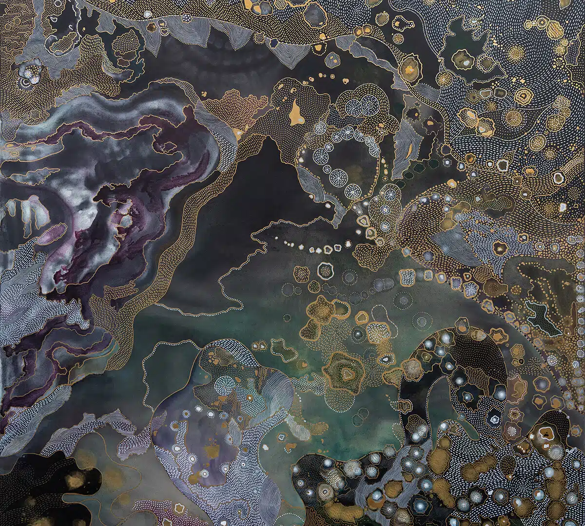 Nowness in Time is a continuation of Trisha Jain’s early work. The two series, Yantra and Tantra that create and expand Jain’s first solo exhibition at Akara Contemporary may initially stand starkly apart from each other, but, on slow immersion through time spent with each painting, the dots and dashes configure themselves differently across canvases to create new compositions.