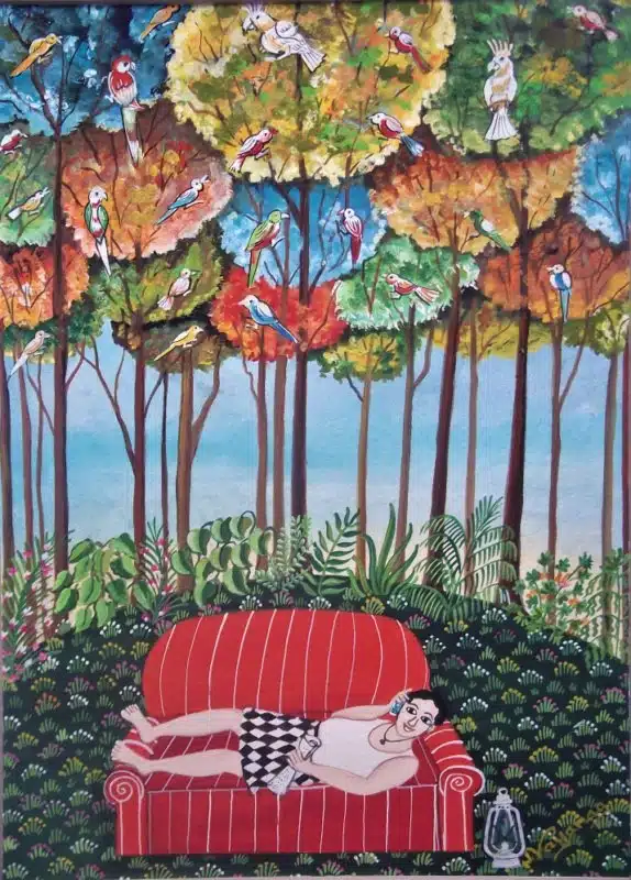 Her visuals provide a frame through which you peep into these painted snapshots of ordinary people with a myriad of fantastical elements like the creatures of wildlife propping up in compositions like a flamingo at the foot of the couch, a zebra peeping in through the window, monkey eating a banana crouched behind a woman. This synthesis of reality with fantasy, of lush green with a synthetically crafted interior, is meshed in a dreamlike nuance. It may be perceived as an ironic juxtaposition of what the balance of ecology has become today or the sheer vibrancy of the composition as a whole clasp on to a utopian vision that cradles a sense of harmony amongst the living.