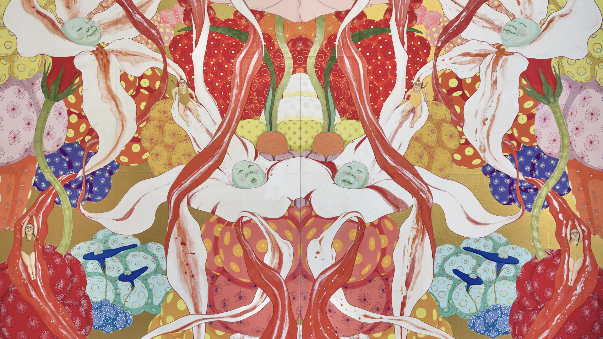 Currently based in Barcelona, Ito presents a body of sculptural works alongside large and small-format paintings that unfold a world of biological extravagance, surreal flowers with human-like faces, swelling organic forms, and luminous colour fields. Rooted in traditional Nihonga techniques, her practice involves layering pigments, sumi ink, and nikawa on Oguni washi, preserving the rigour of Japanese craftsmanship while expanding its visual language.