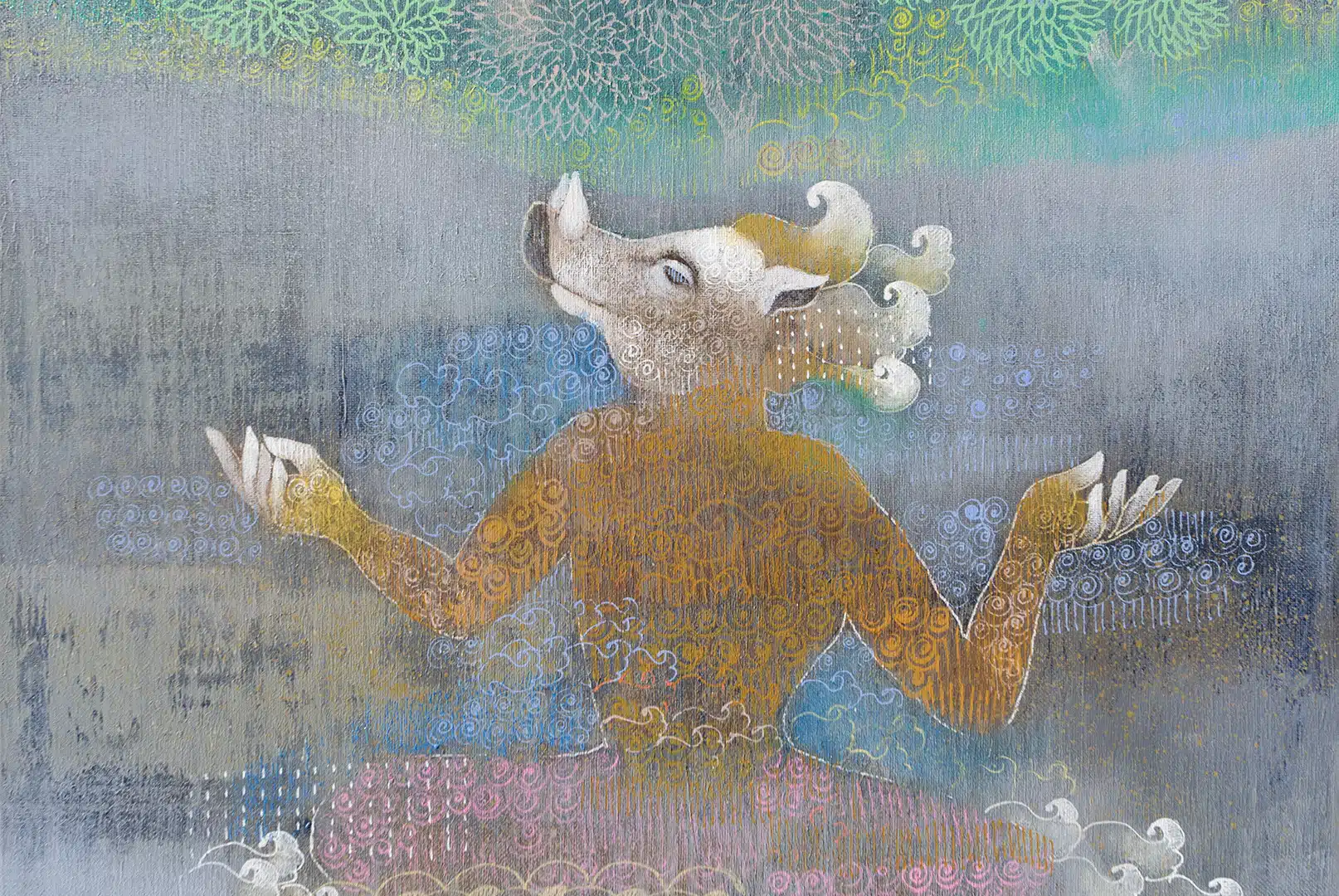 The exhibition captures the synergy and the deep symbiotic relationship between humans and nature through Das’ recent body of works that she calls Pravah or flow. In her art, characterised by soft hues and pastel flourishes, one sees a truant deer absorbed in abundant nature. She juxtaposes the human form with generous flora and fauna, one flowing into the other seamlessly. Her brush captures it all: the rivers and seas that sustain and nourish all beings, thus recreating the cosmic energy inside us and around us that is ever flowing.