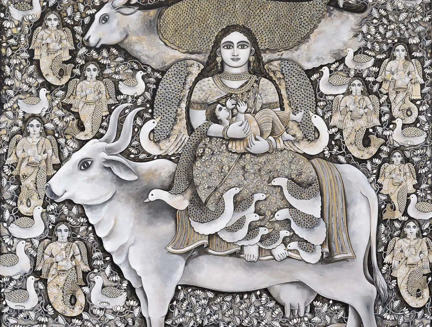 Gallery Art Exposure presents a solo exhibition of new works by Jayasri Burman, River of Faith, the artist’s most significant exhibition to date. Strongly influenced by spiritual beliefs and sacred texts, Burman expresses her creativity with poetic lyricism that is part fairytale and part organic. The Ganga river has had an indelible impact on her and she has painted the river in myriad forms with allegorical elements like swan, flowers, vines, fish and more. The recent devastation and destruction of the waters of the river as an aftermath of the pandemic greatly stirred her and ultimately culminated in Rivers of Faith.