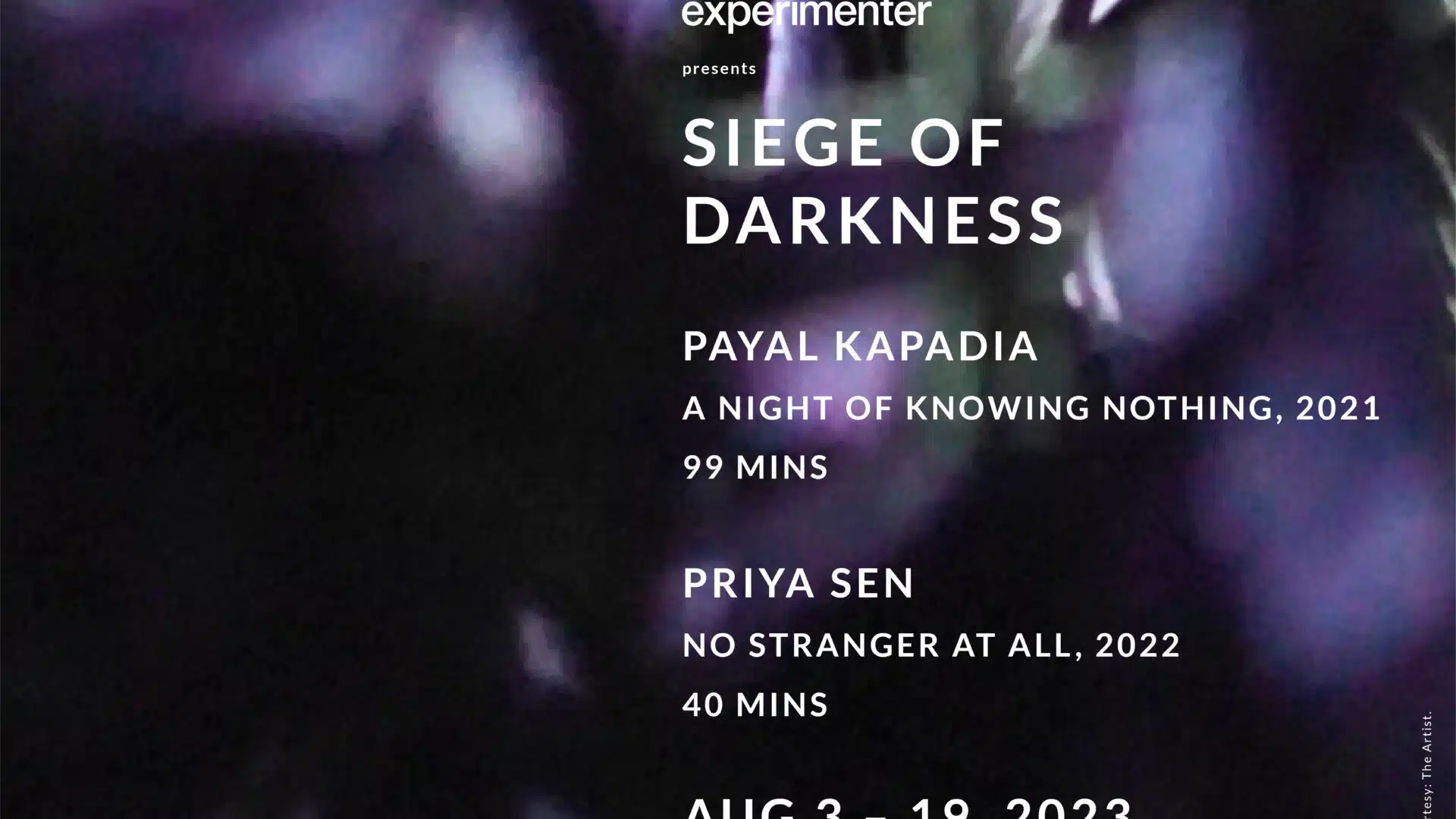 Experimenter presents Siege of Darkness, an exhibition of two crucial films by artists and filmmakers Payal Kapadia and Priya Sen that underscore the swiftly changing dynamics of our social and political constructs and question the fundamental ways in which we experience relationships and share a common space of cohabitation and camaraderie, in an increasingly unstable and intolerant time.