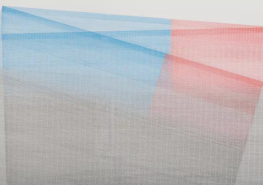 Gupta’s visual language is born from minimalism. All of her works appear deceptively simple at first, but with time their complex programs and internal intensities become apparent. Drawings composed from overlapping parallel lines, in two and three colours, seem to defy perception, oscillating in front of the viewer and possessing a vibratory charge. Her main subject is the square, yet this most serene of geometric forms is torqued, layered, multiplied, and confounded to create works of heightened tensions.