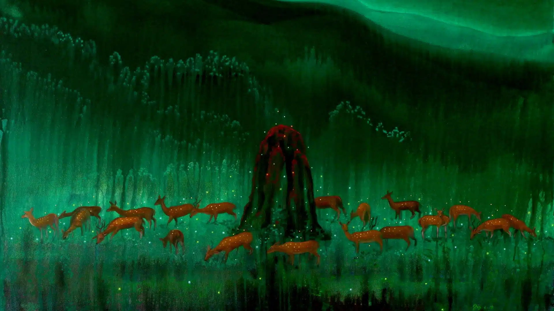 From Henri Rousseau to Senaka Senanayake, tropical forests and groves have been a source of inspiration for many great artists. Aji Adoor’s tropical landscapes show lush greenery, blue mountains, sometimes covered with snow, and what appear to be shimmering northern lights. These serene and bucolic mountainscapes are informed by the artist’s profound sense of perspective and depth.