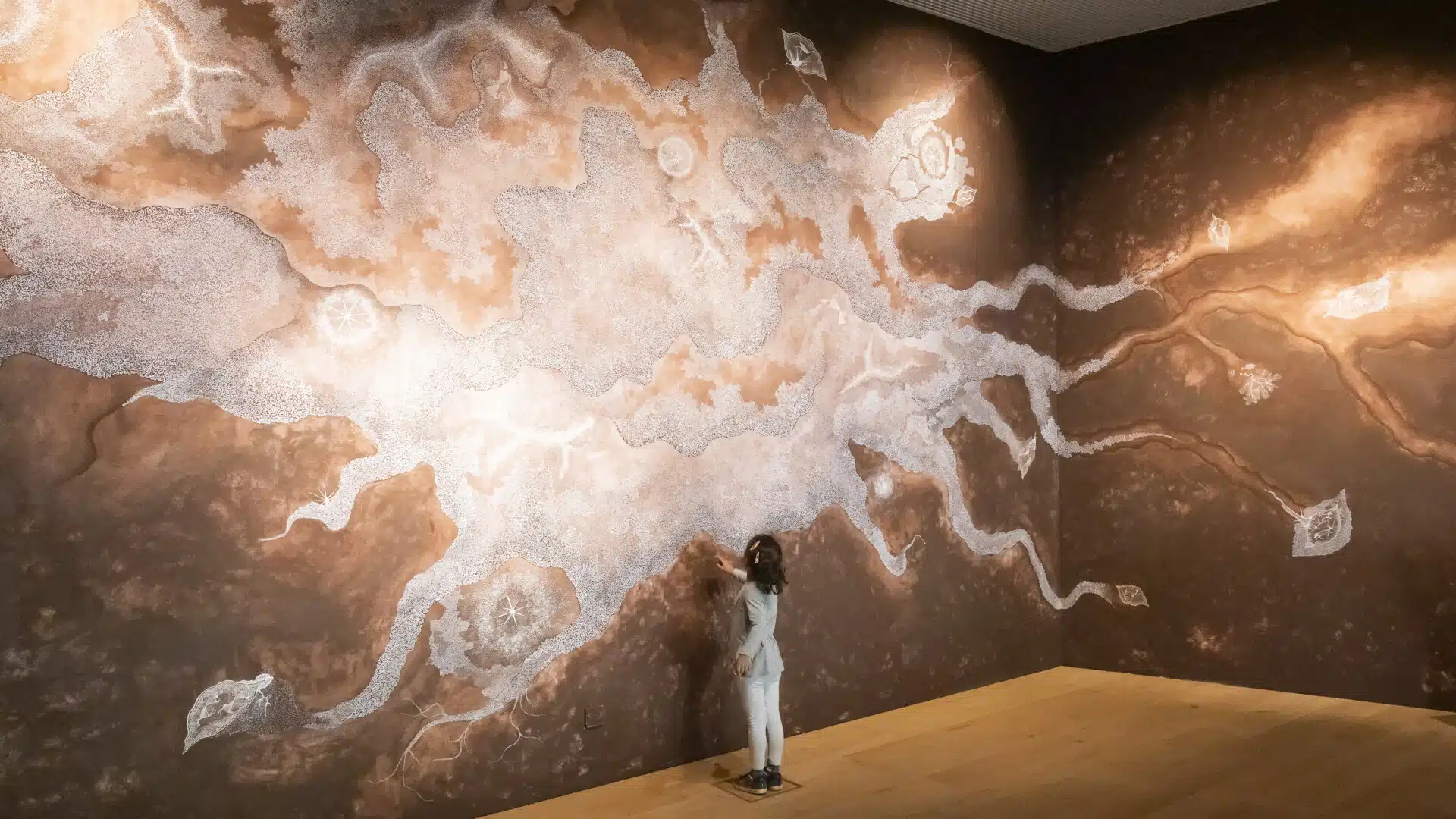 In this exhibition, a video interview showcases the women-led initiatives of Navdanya, regenerating thousands of years of rural wisdom through songs, stories, and prayers to protect seeds and restore biodiversity. In addition to video interviews, the Cabinet resonates with a song brought to us by The People’s Archive of Rural India (PARI). Sung by the women of rural Maharashtra, these devotional poems express deeply personal couplets on agriculture, rural politics, and society. A commissioned mural by sibling artists Mayur and Tushar Vayeda adorns the Cabinet walls, representing a Warli Adivasi (Indigenous) story on the birth of seed, rendered in the distinct traditional Warli painting method. The mural resembles a prehistoric cave painting; a visual depiction of the primordial creators of the world.